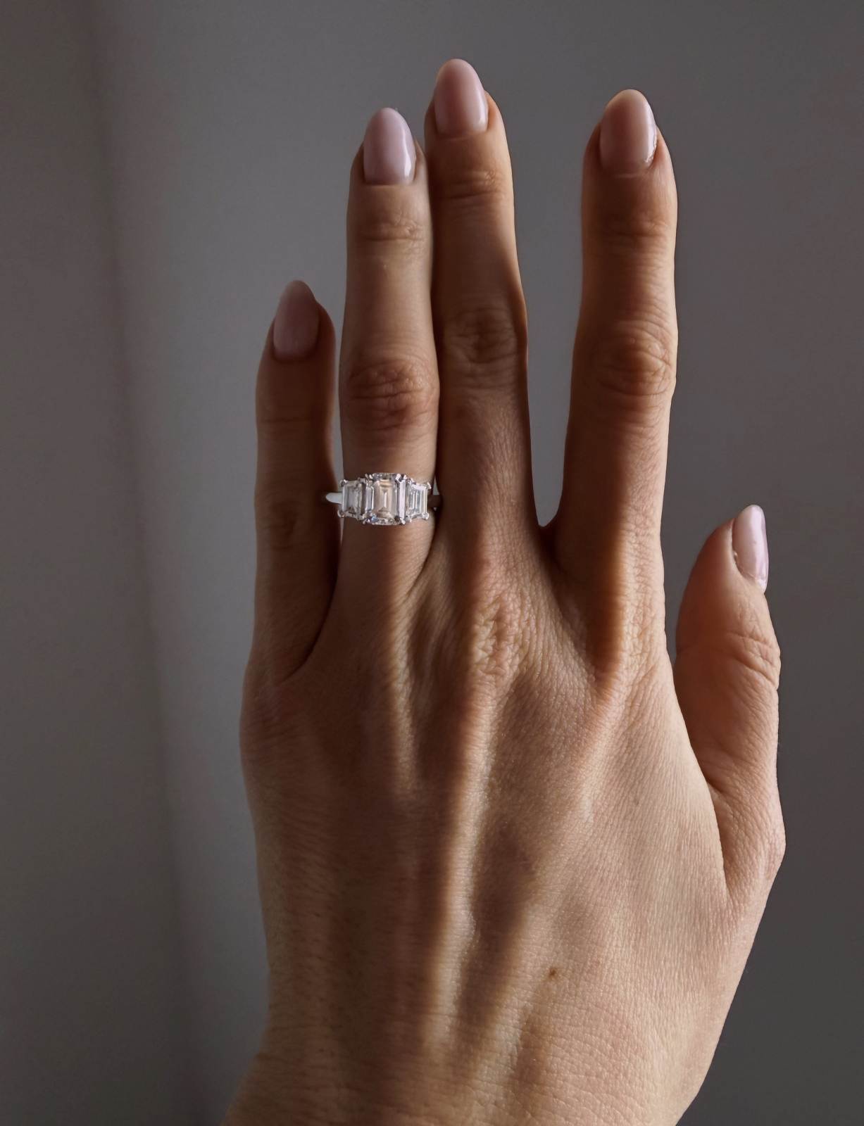 Piatra centrală, un moissanite de 2 carate, tăietură Emerald, fascinează prin claritatea sa geometrică și reflexiile limpezi care amintesc de oglinzi de lumină pură. Două moissanite laterale de 0,3 carate fiecare completează perfect designul, adăugând profunzime și simetrie.