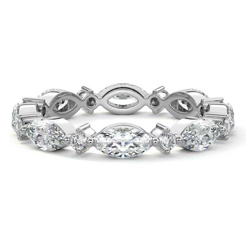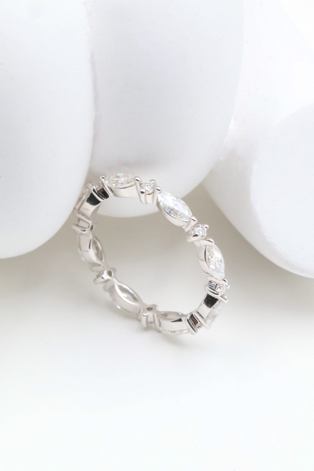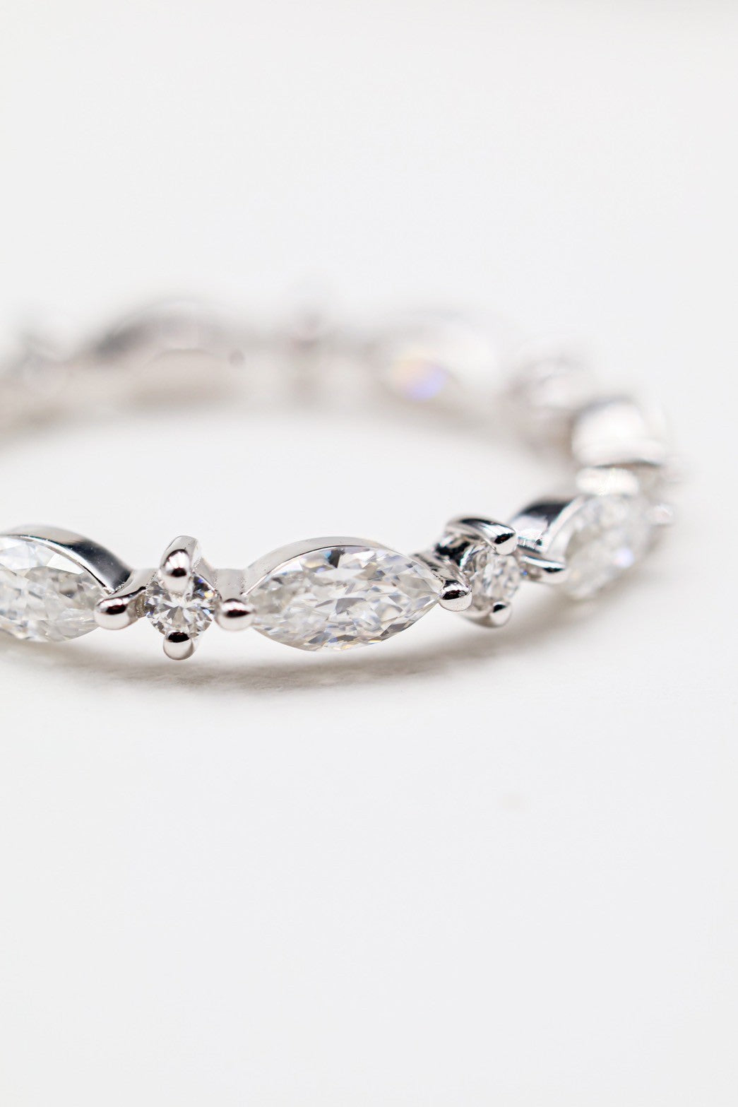 Elegant și rafinat, acest inel semieternity este realizat din argint placat cu platină, oferind un luciu nobil și o rezistență excelentă în timp. Împodobit cu moissanite strălucitoare de 1,1 ct în total, de culoare D și claritate VVS, inelul combină tăieturi marquise și rotunde într-un joc echilibrat de forme și străluciri. Pietrele sunt așezate cu grijă într-o montură delicată, evidențiind frumusețea fiecărei fațete.