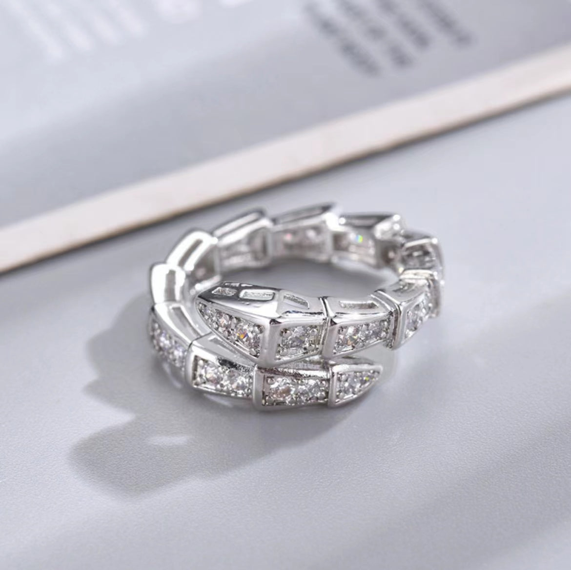 Îmbină eleganța clasică cu luxul contemporan cu acest inel snake, inspirat de stilul iconic Bulgari. Confecționat din argint placat cu platina, inelul aduce un design inovator și sofisticat, inspirat de forma fluidă a unui șarpe. Decorat cu moissanite de culoare D și claritate VVS, inelul reflectă o strălucire captivantă și o frumusețe unică, perfect pentru a adăuga un accent de rafinament fiecărei ținute.