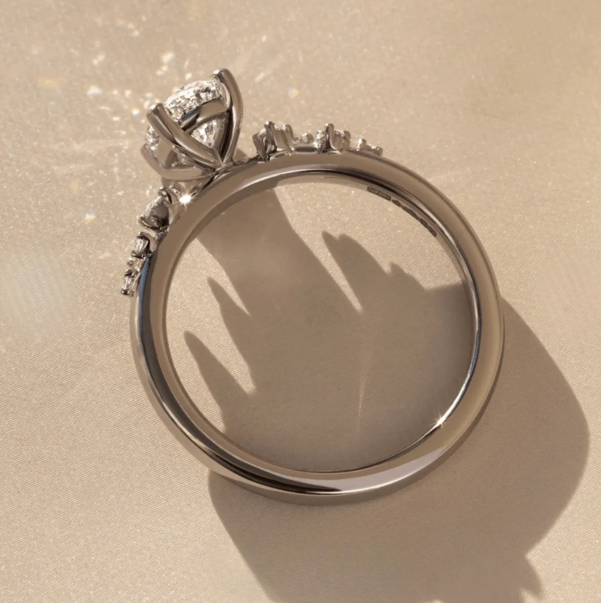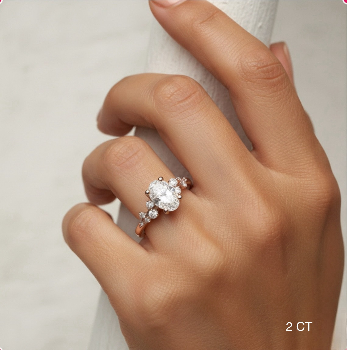 Un inel de logodnă cu un aer poetic, perfect pentru un moment memorabil. Această piesă delicată este realizată din aur sau platina, fiind accentuată de o piatră centrală impresionantă: un moissanit de 1 sau de 2 carate, tăietură ovală, culoare D și claritate VVS — un simbol strălucitor al iubirii pure.