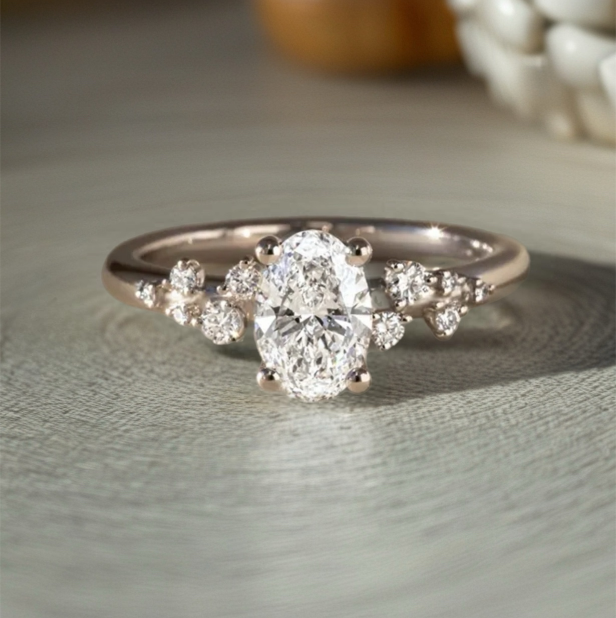 - Piatră centrală: moissanit 1 sau 2 ct, culoare D, claritate VVS, tăietură ovală