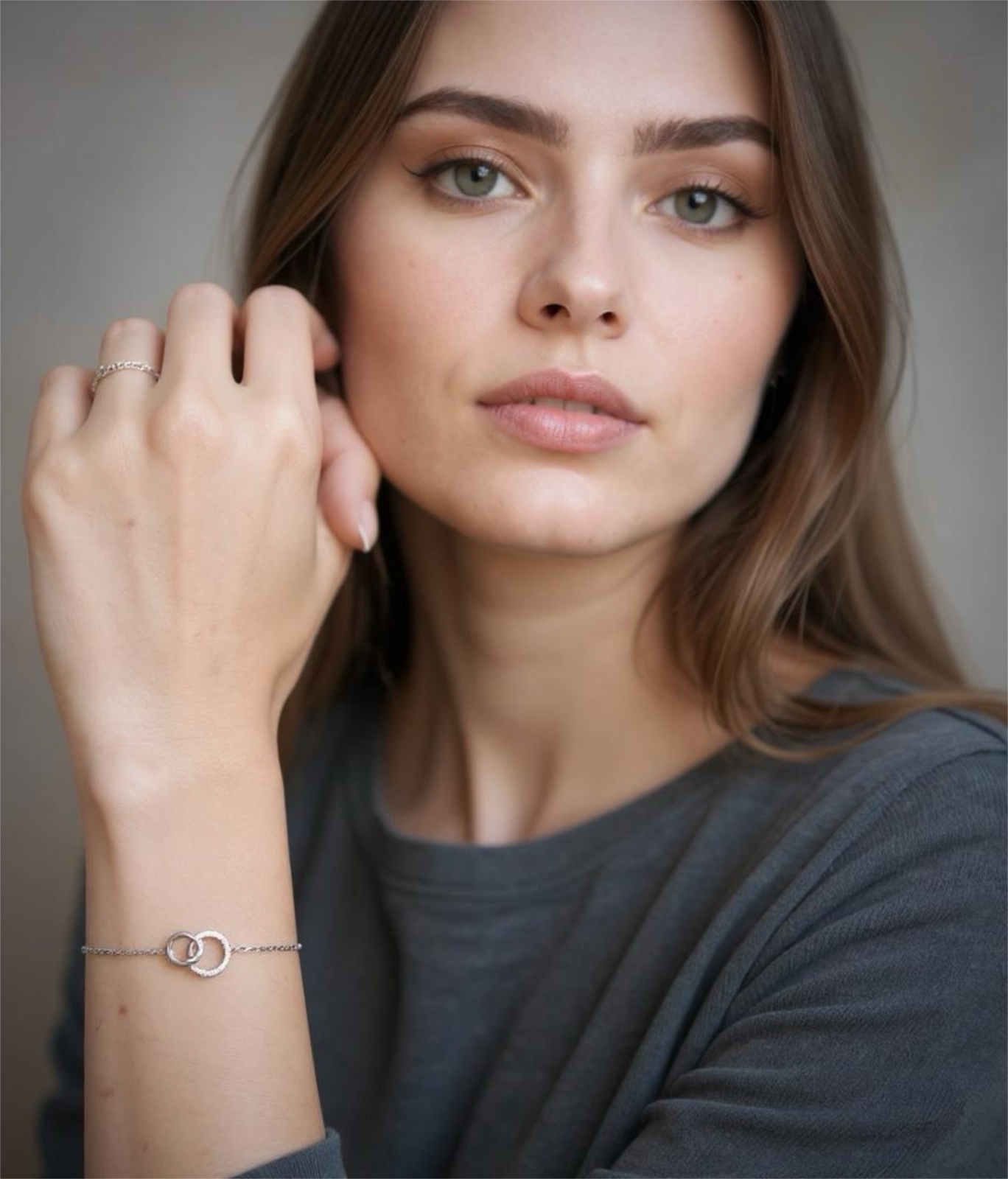 - Pandantiv: Două cercuri interconectate, unul decorat cu moissanite și celălalt simplu