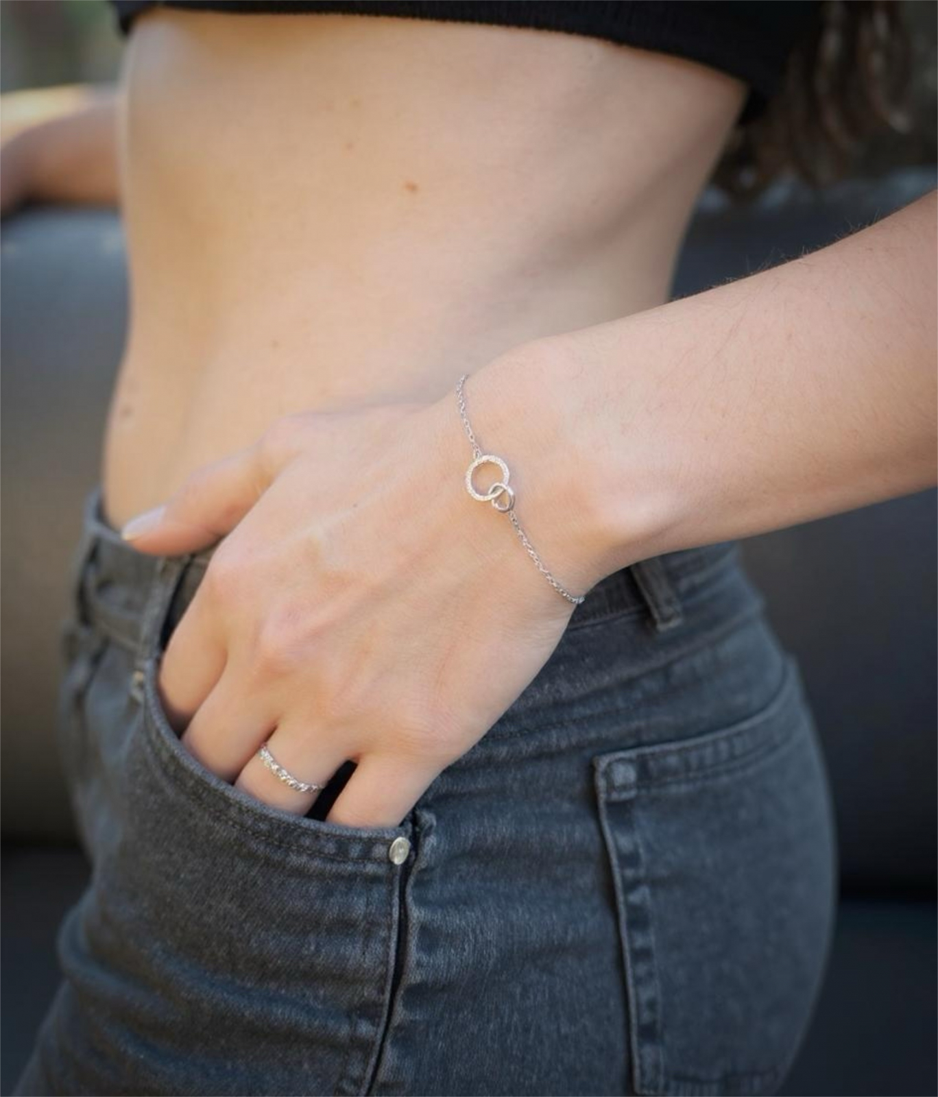 Îmbină rafinamentul cu eleganța minimalistă prin această brățară deosebită din argint 925 placat cu platina, un accesoriu versatil și sofisticat. Pandantivul este format din două cercuri - unul cu moissanite de culoare D și claritate VVS ce captează privirile prin strălucirea sa impecabilă, iar celălalt cerc rămâne simplu, creând un contrast subtil și modern.