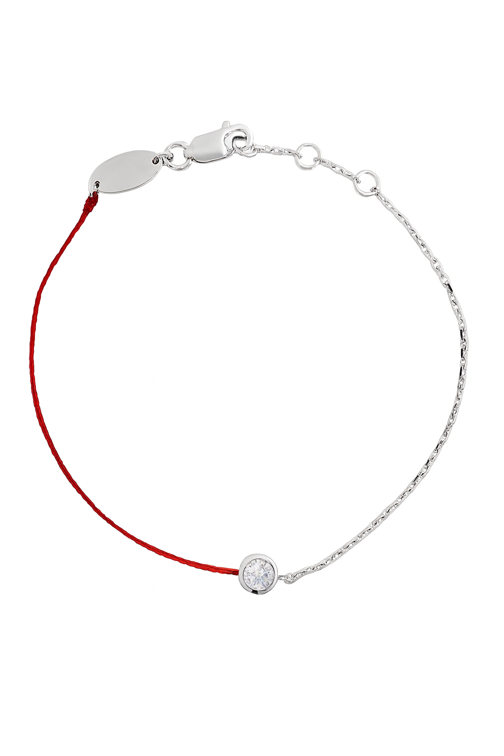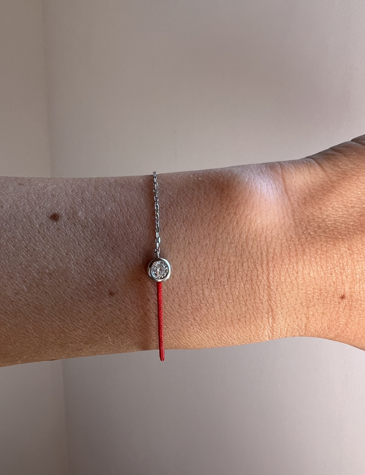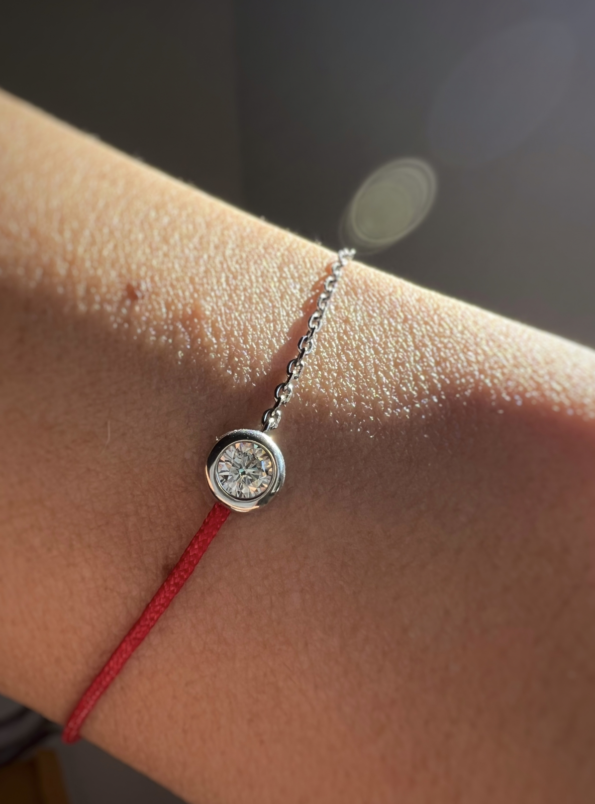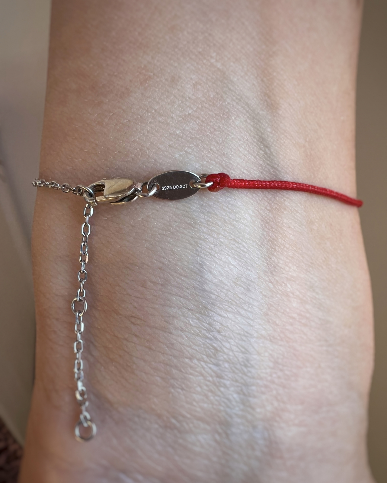 Brățară elegantă cu design modern și simbolistică rafinată, ce îmbină strălucirea irezistibilă a moissanitului cu simplitatea șnurului roșu norocos. Piatra centrală, un moissanite de 0,3 ct (4 mm), montat în montură bezel, din argint 925 placat cu platină, oferă un joc de lumini spectaculos, fiind cunoscută pentru claritatea și focul ei intens.