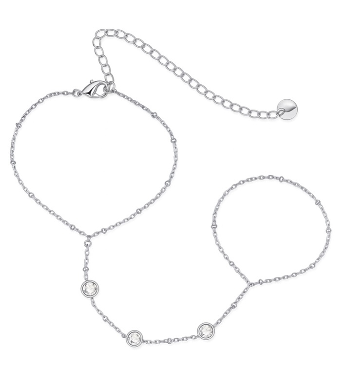Această brățară elegantă de tip "hand chain" este realizată din argint 925, placat la alegere cu aur galben sau platină, oferindu-i un finisaj strălucitor și durabil. Designul său rafinat unește un inel subțire cu brățara propriu-zisă printr-un lanț delicat, punând în valoare grațios linia mâinii.