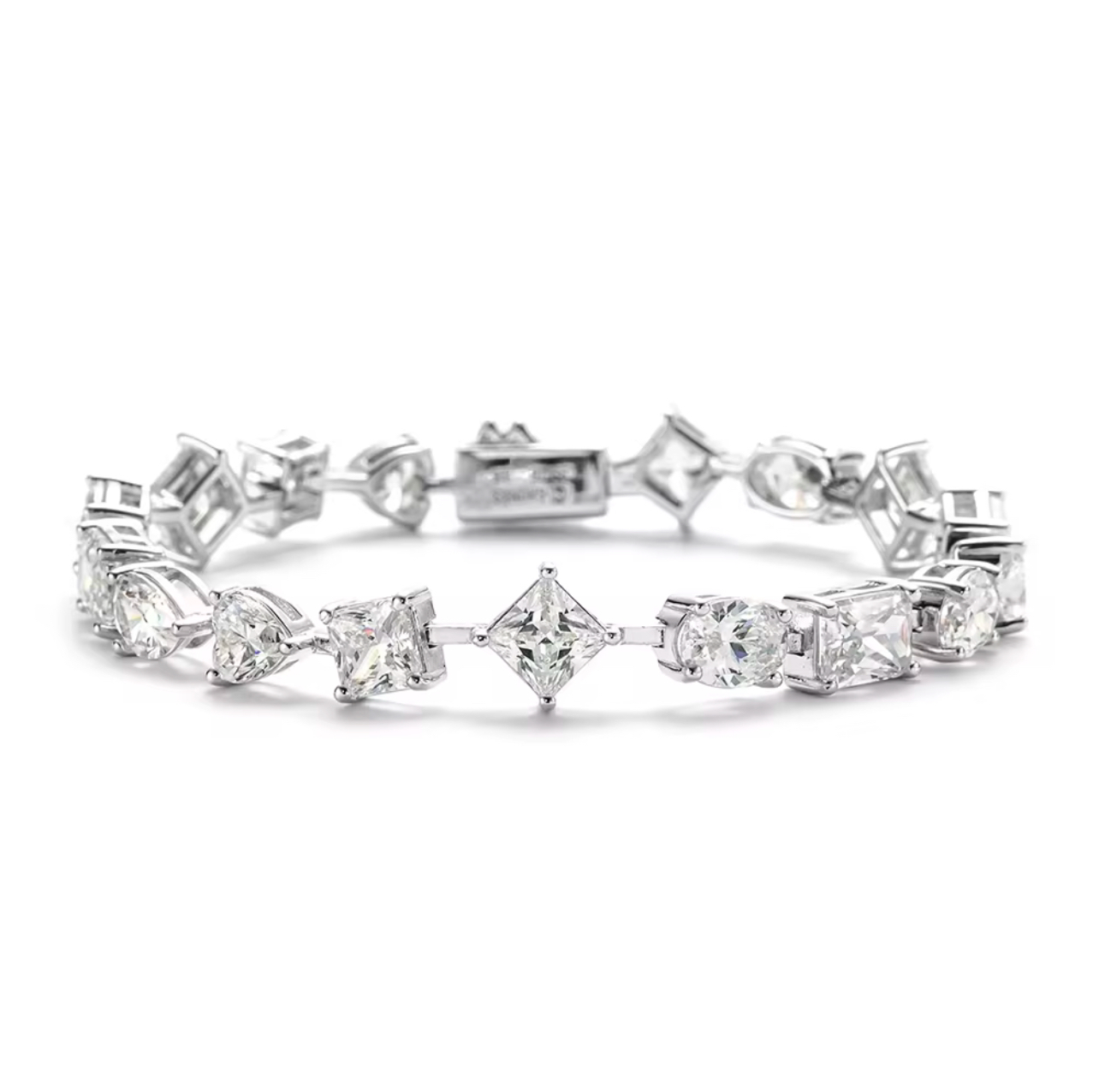 Adaugă un strop de rafinament și unicitate colecției tale de bijuterii cu această brățară tennis spectaculoasă, ce combină moissanite de diferite tăieturi pentru a crea un efect vizual inedit și deosebit. Fiecare piatră este tăiată în stiluri emerald, para, asscher, ovala, princess și inimă, oferind un joc fascinant de forme și lumini.