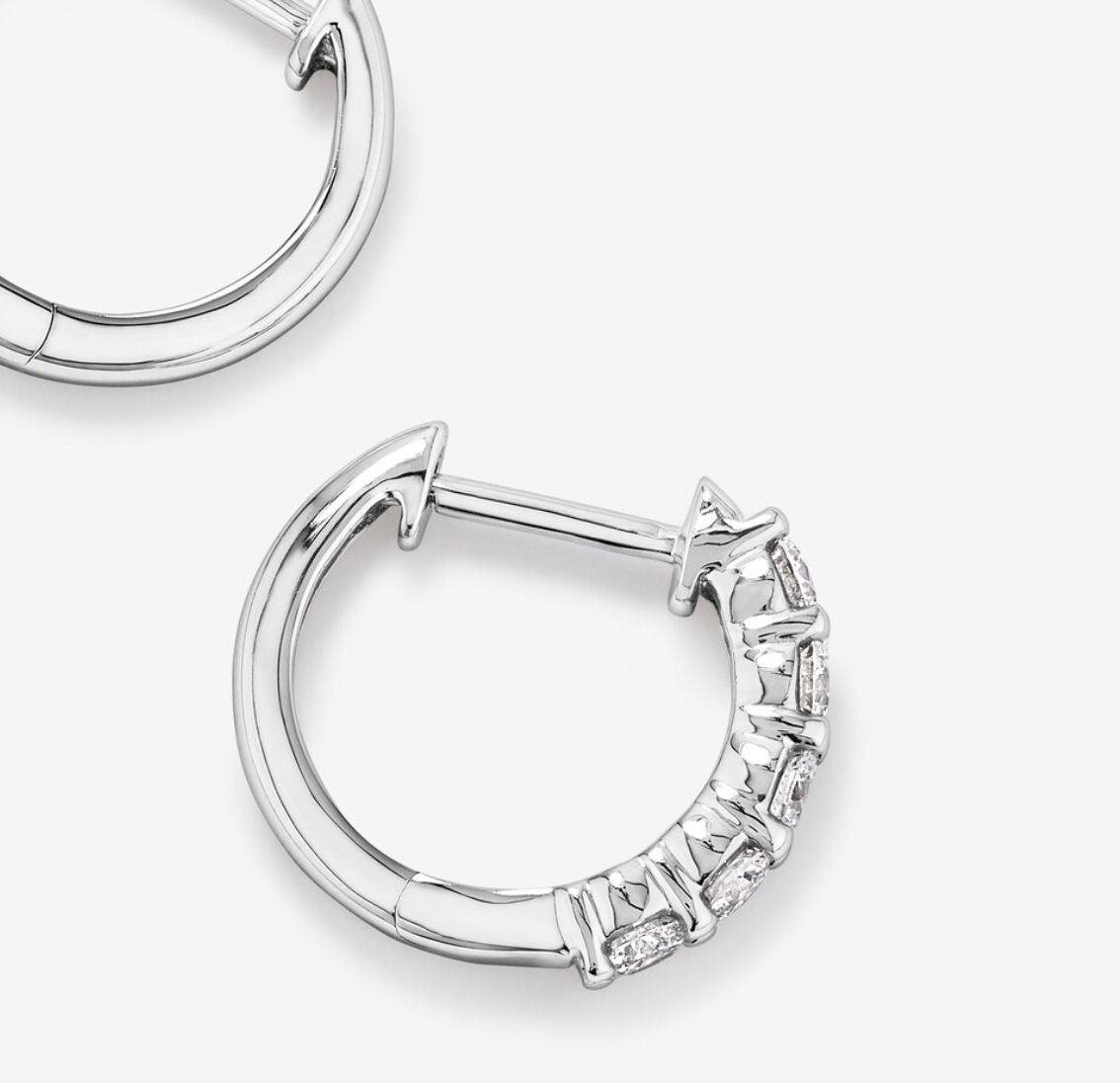 Cerceii din argint Brilliant Hoops placati cu platina, imbracati in pietre Moissanite de 3.5 mm, 0.2 carate fiecare, perechea insumand astfel 2 carate (0,2 x 5; 1 CT x 2), culoare D, claritate VVS1, taietura excelenta. Diametrul interior al cercelului este de 1,5 cm.