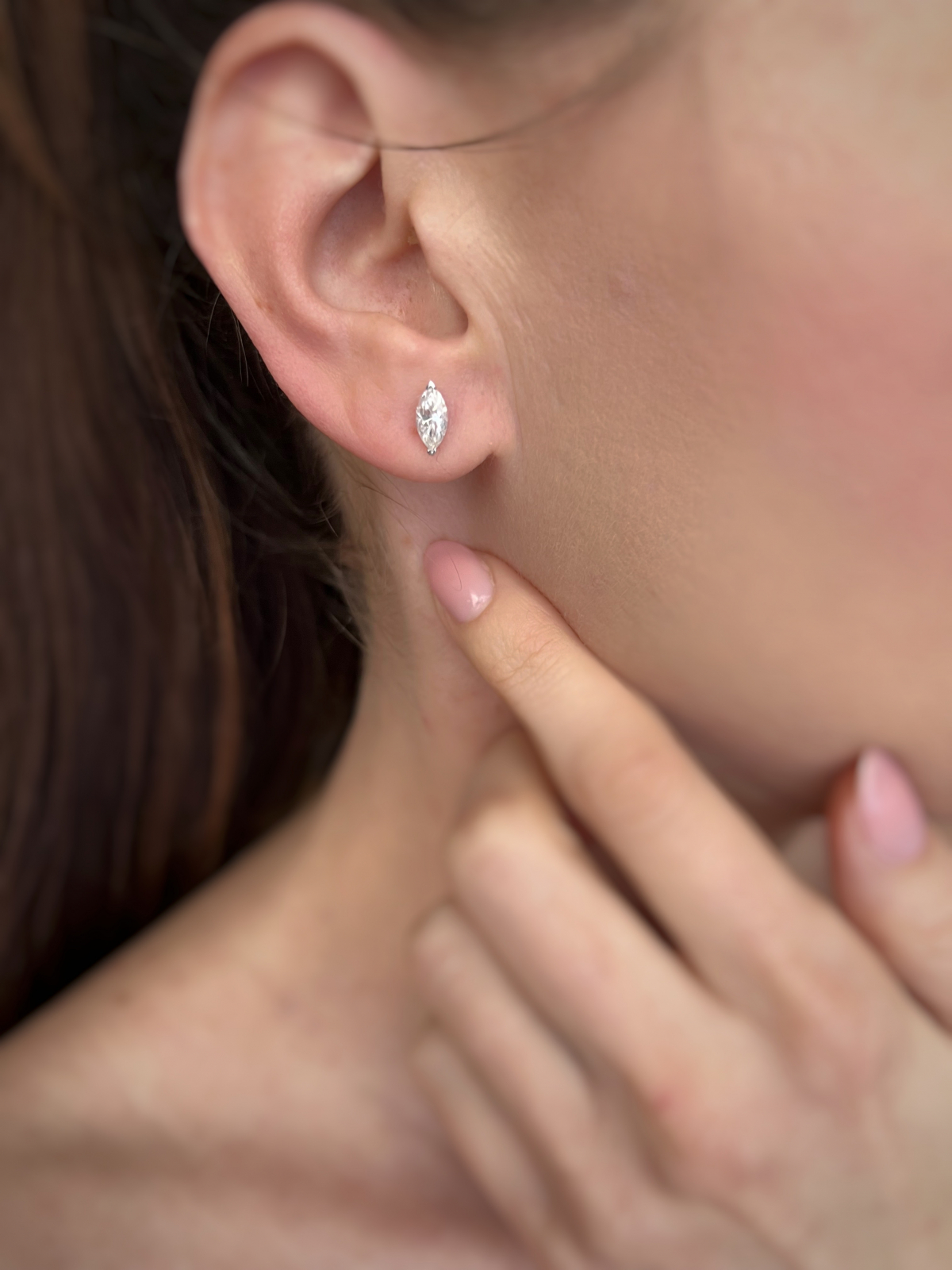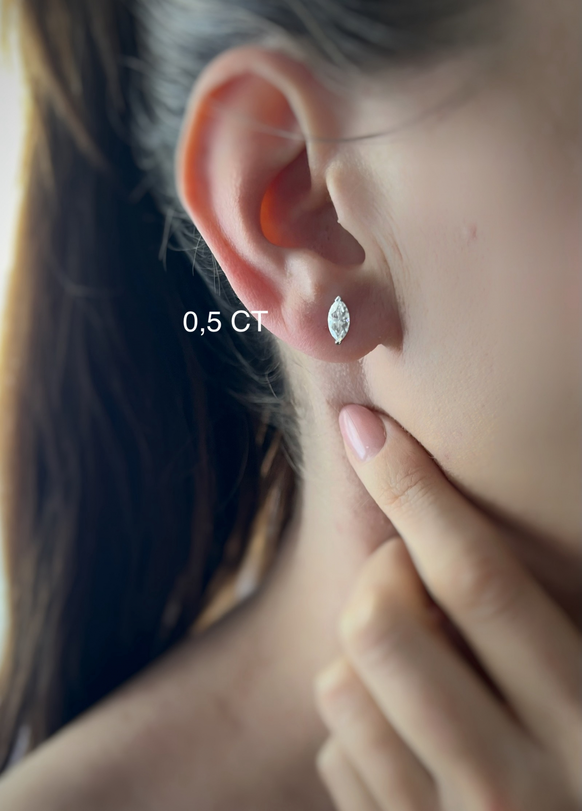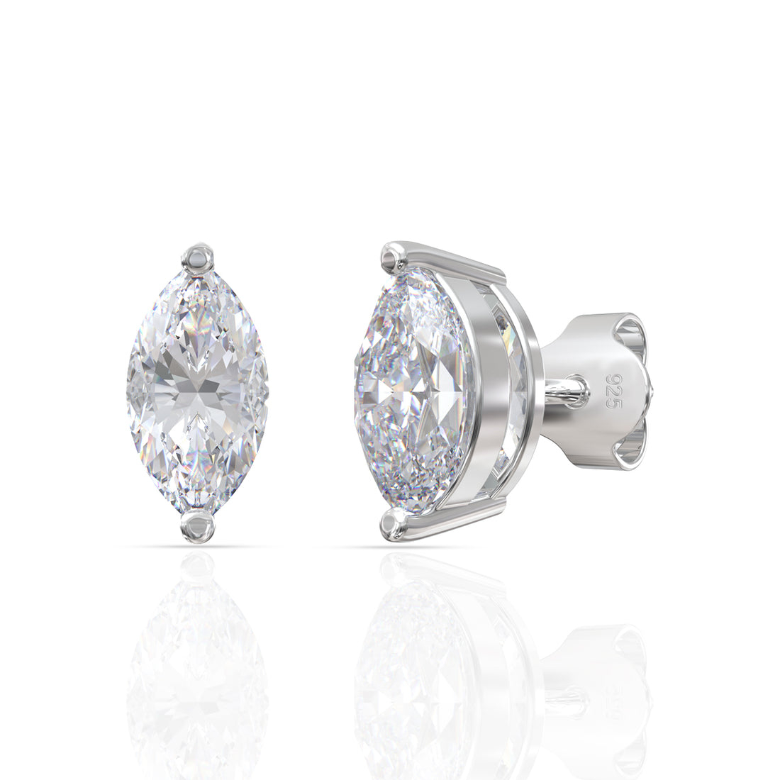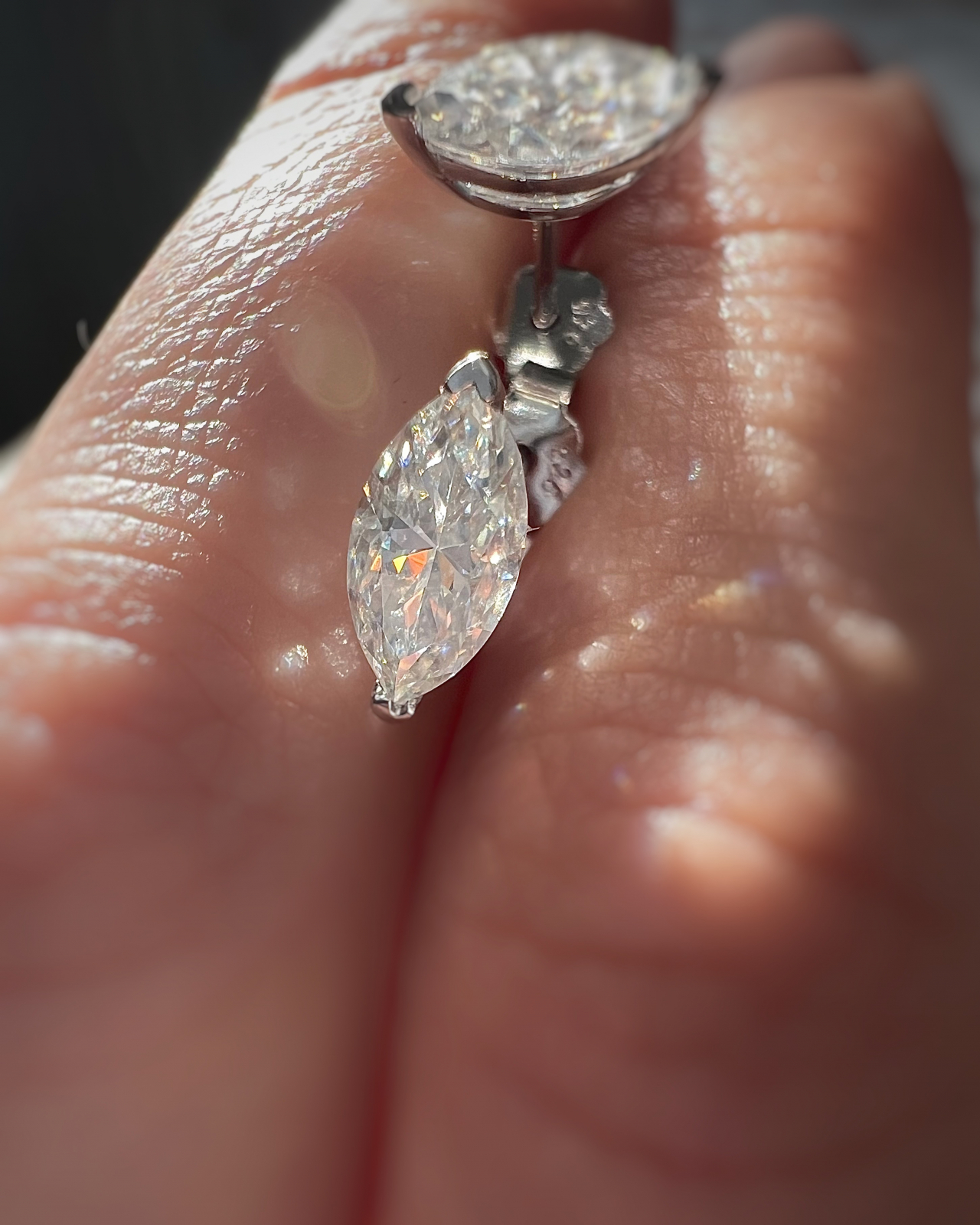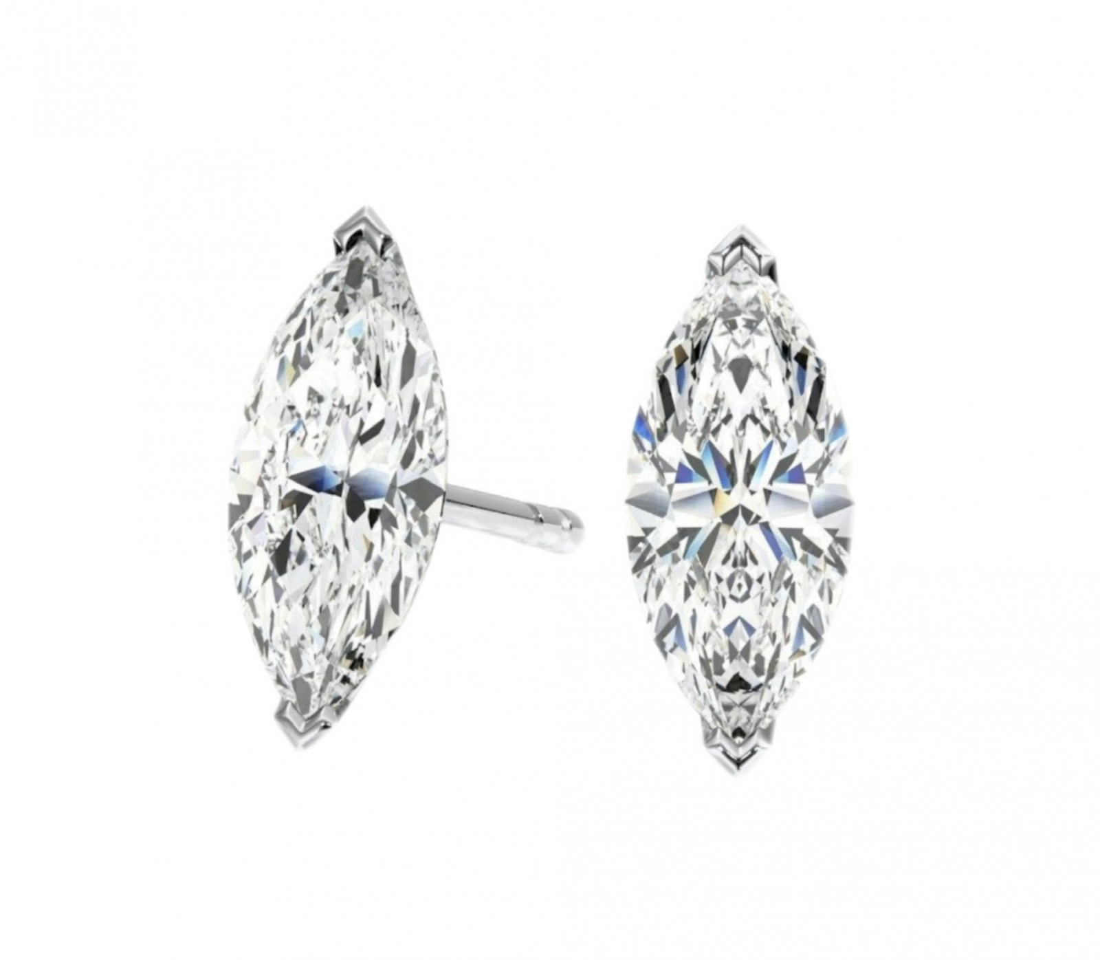 - Pietre: Moissanite de 1 (0,5x2) sau 2 (1x2) carate fiecare, cu tăietura marquise (marchiza), care oferă un efect elegant și alungit