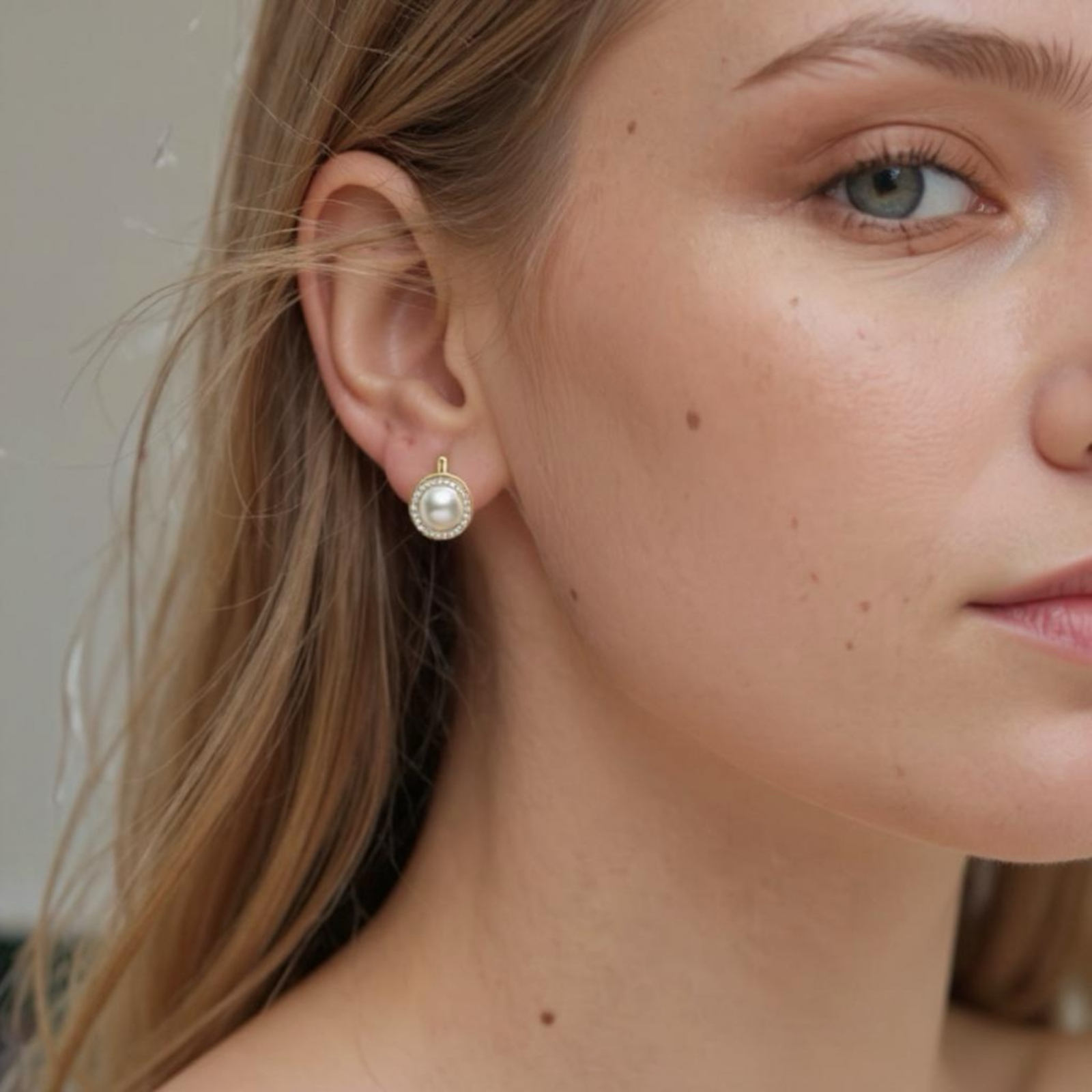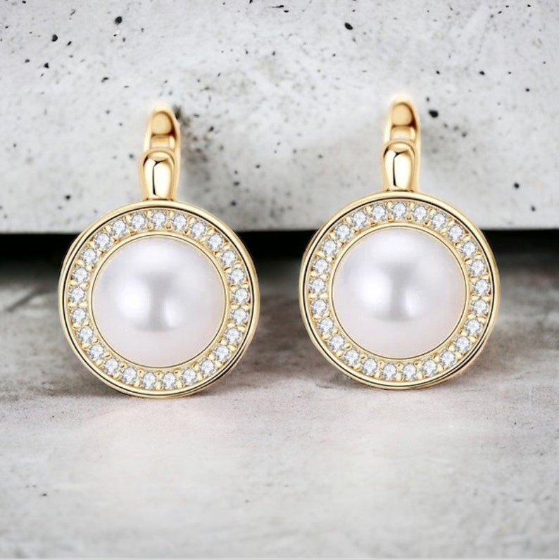 Realizați din argint 925 placat cu aur galben de 18K sau platină, cerceii impresionează prin perlele de cultură perfect rotunde, cu diametru de 7 mm, accentuate de un cerc delicat format din 50 de moissanite rotunde briliante (1 mm fiecare), cu o claritate superioară VVS și culoare D. Sistemul cu tortiță oferă siguranță și confort pe tot parcursul zilei.