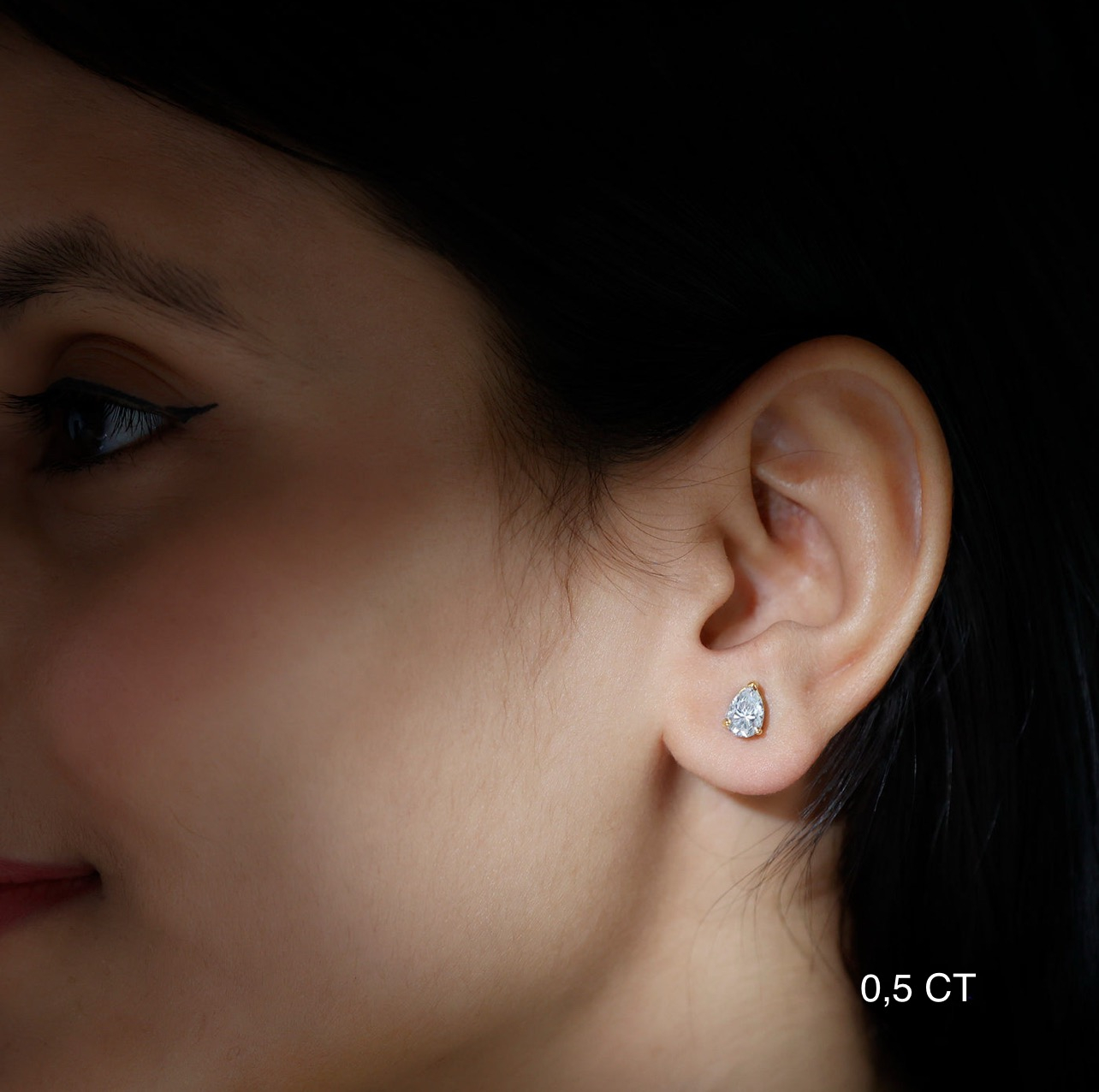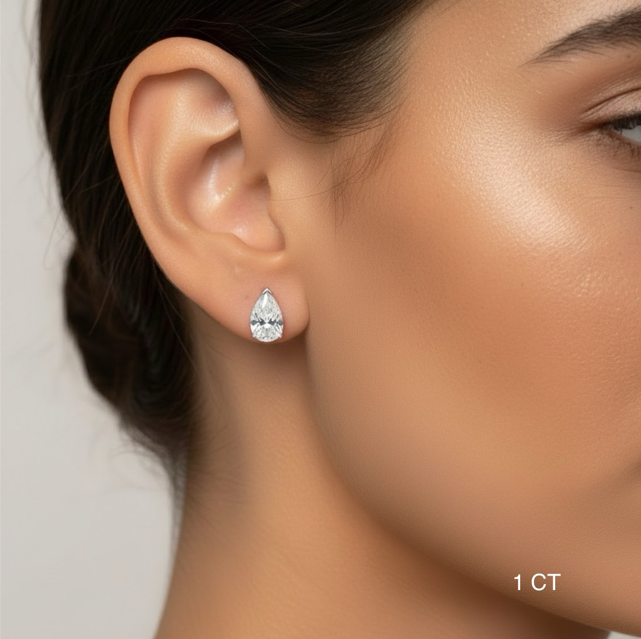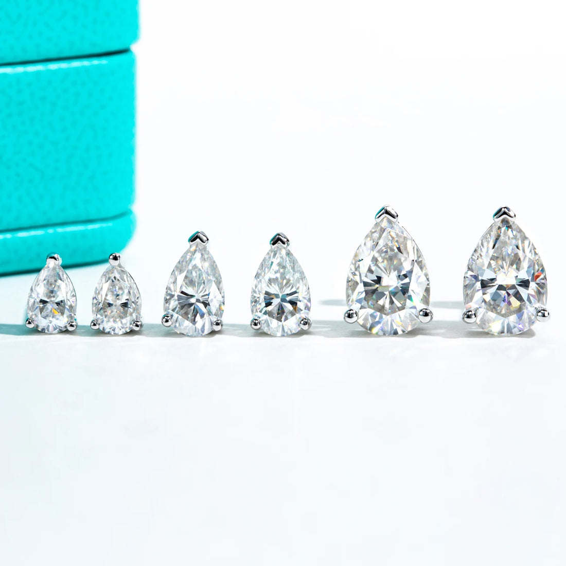 Cerceii Pear Brilliance cu montura in 3 gheare, sunt creati cu moissanite de 0,5, 1, 2 sau 4 carate, setate in argint placat cu platina sau aur galben. Acestia sunt marcati atat pentru argint, cat si pentru caratele moissanitelor. Marcajul caratelor este identic cu cel al diamantelor.