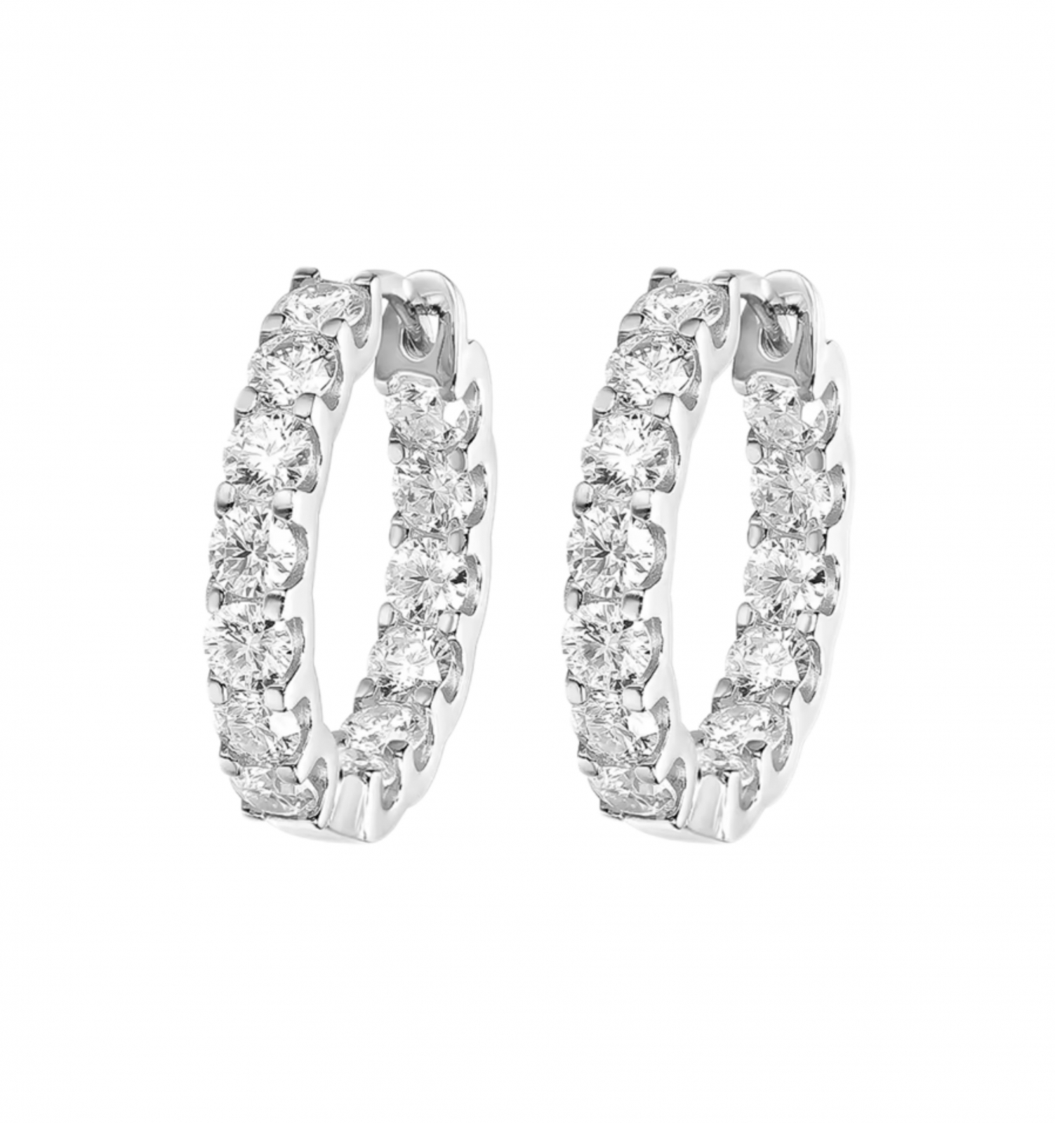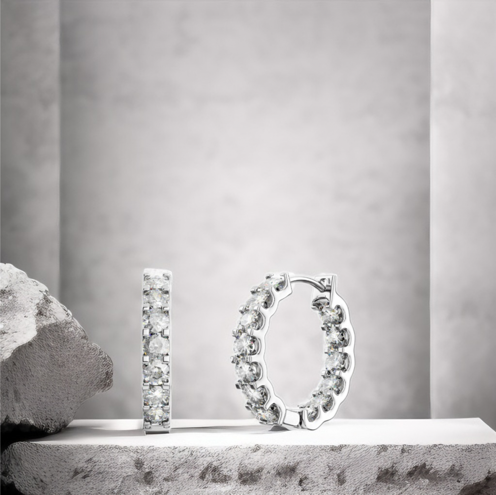 Acești cercei cu stralucirea radiantă sunt realizați din argint 925 și placați cu platina sau aur galben la alegere. Imbracati in 26 de moissanite de culoare D, claritate VVS1, acestia au un total de 2,6 carate ( 1,3 CT x 2), fiecare piatra avand 0,1 carat ( 3 mm). Diametrul interior al cercelului este de 2 cm.