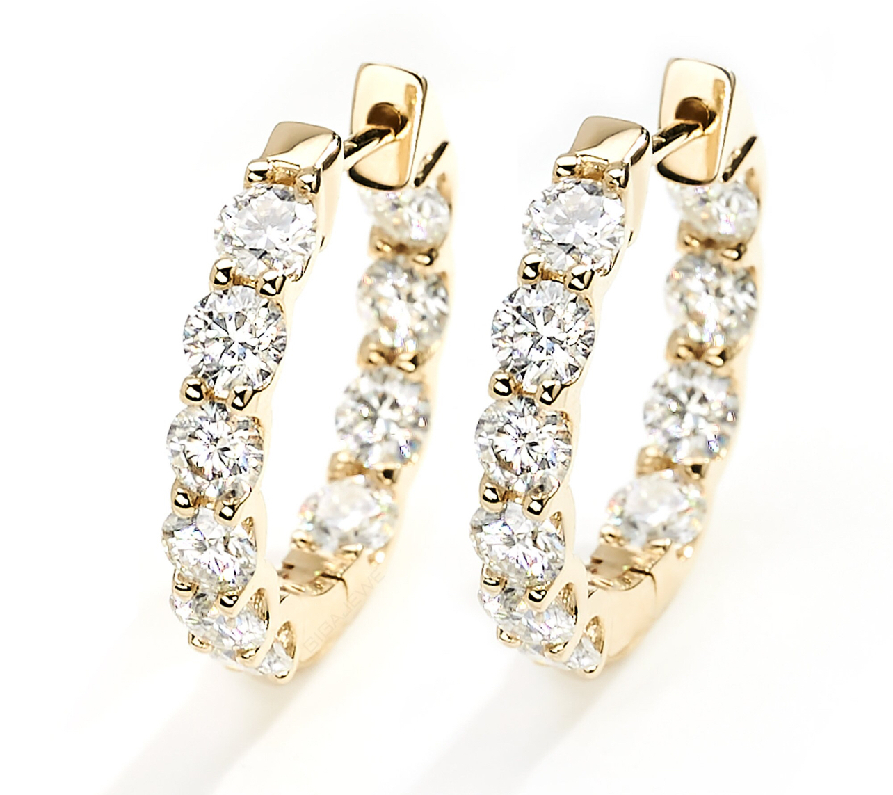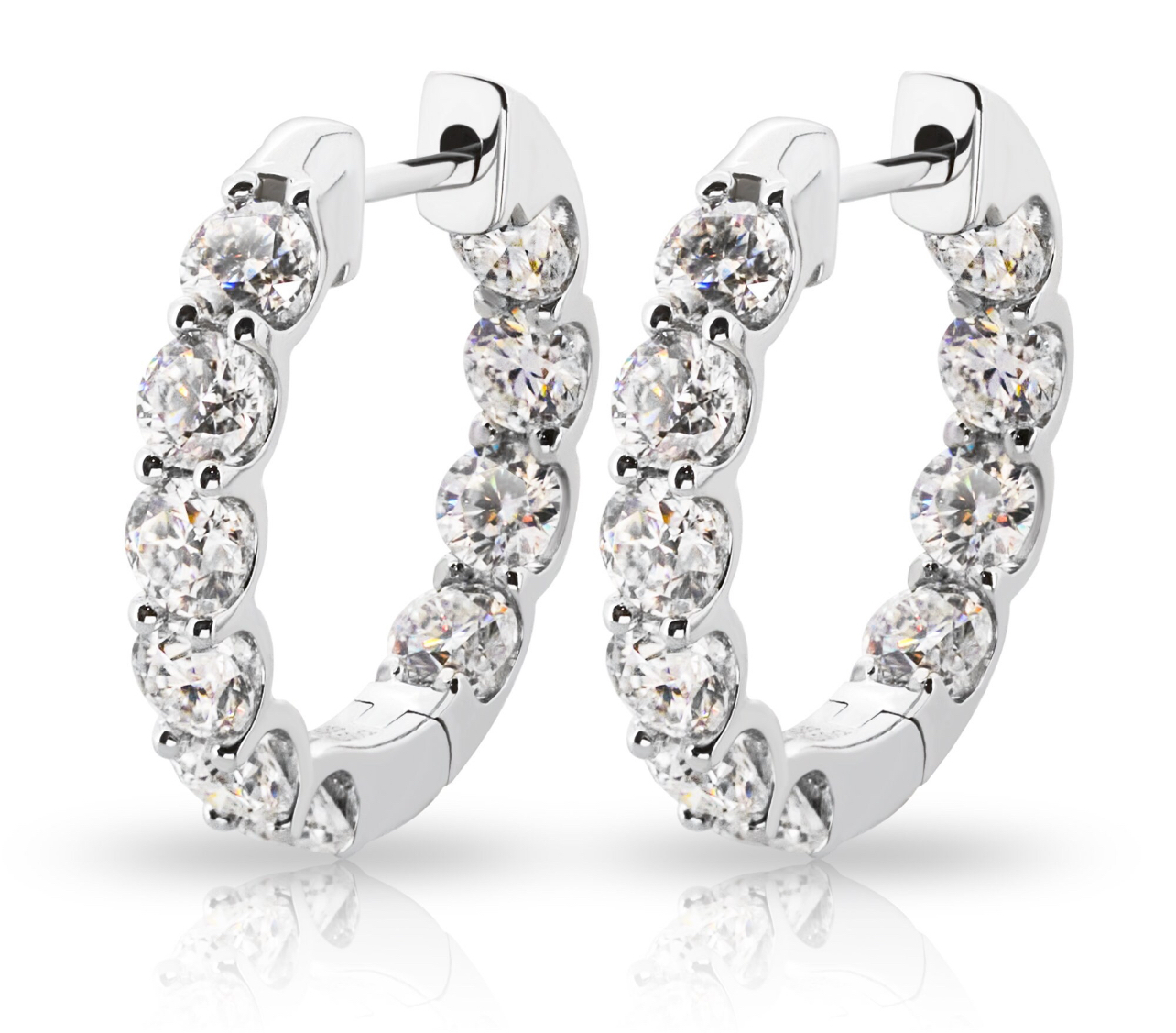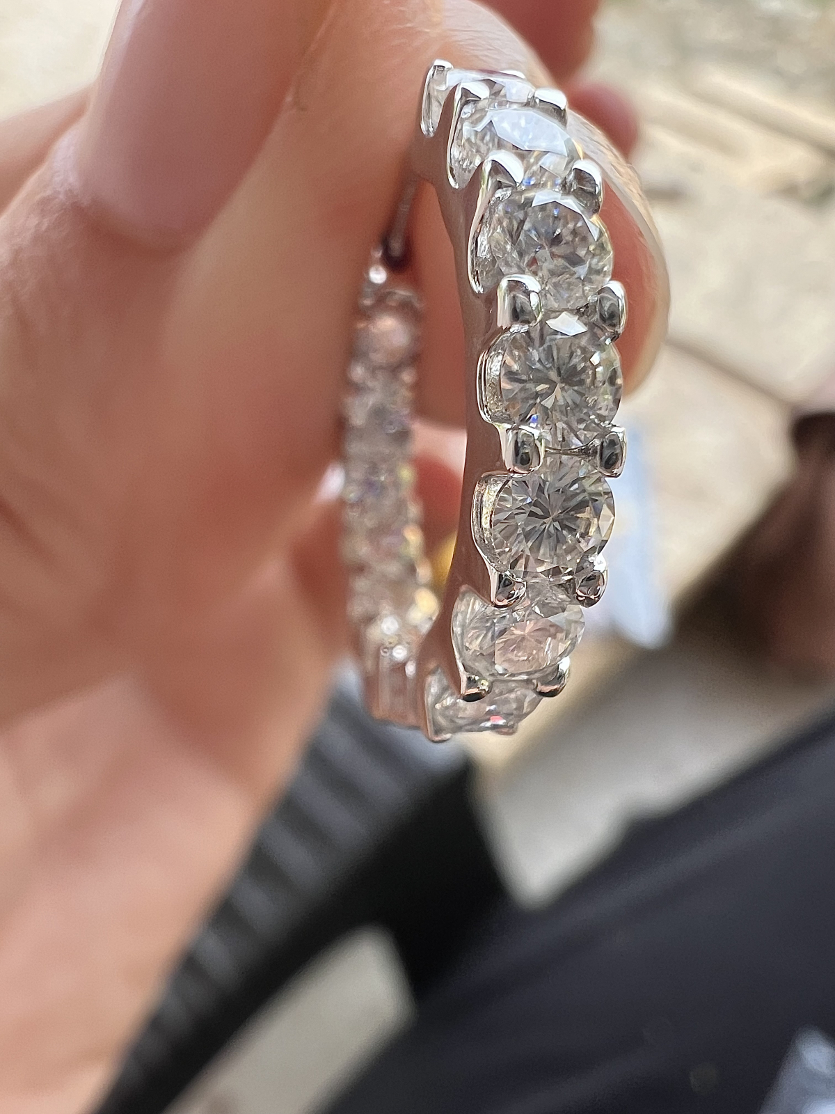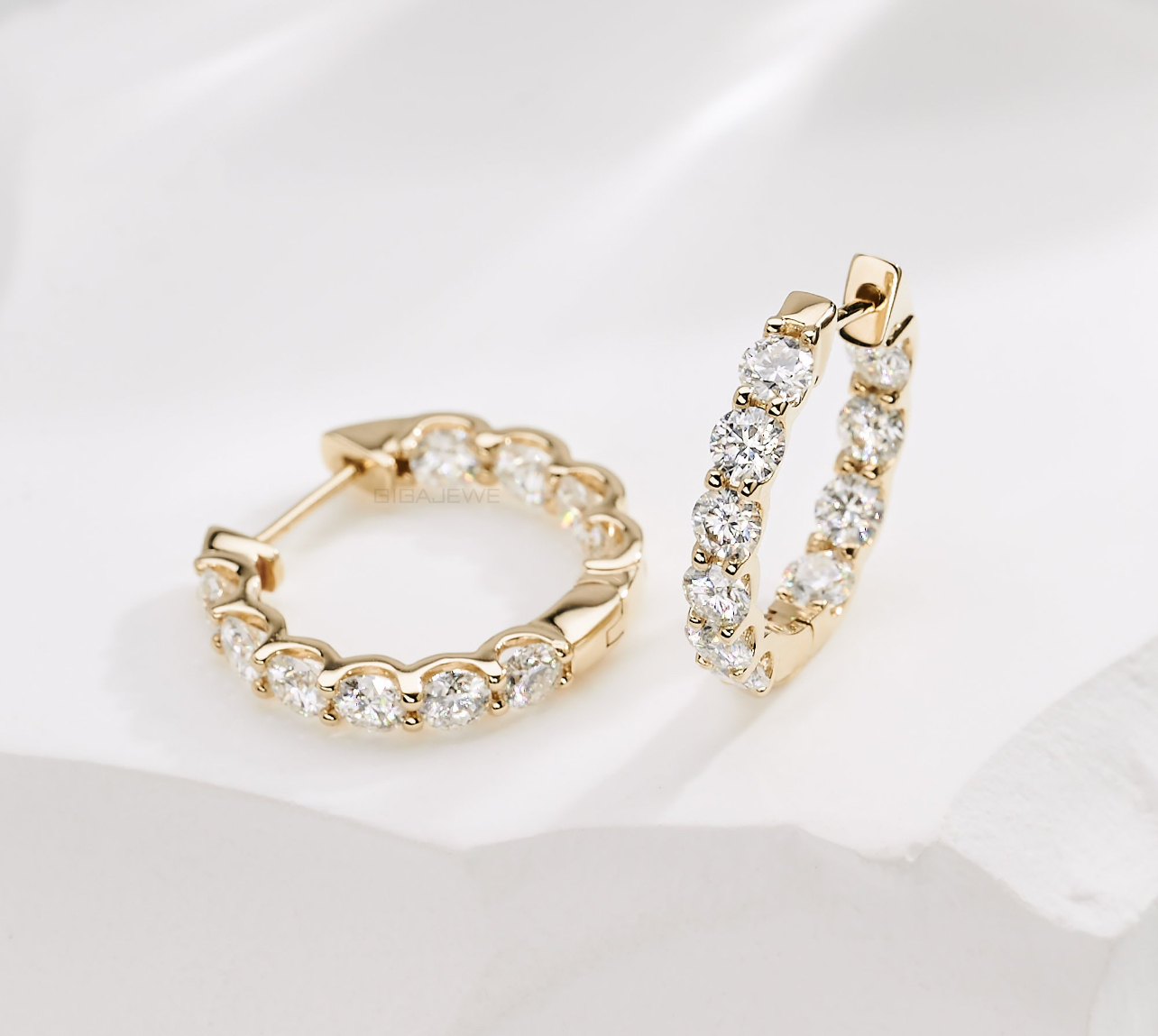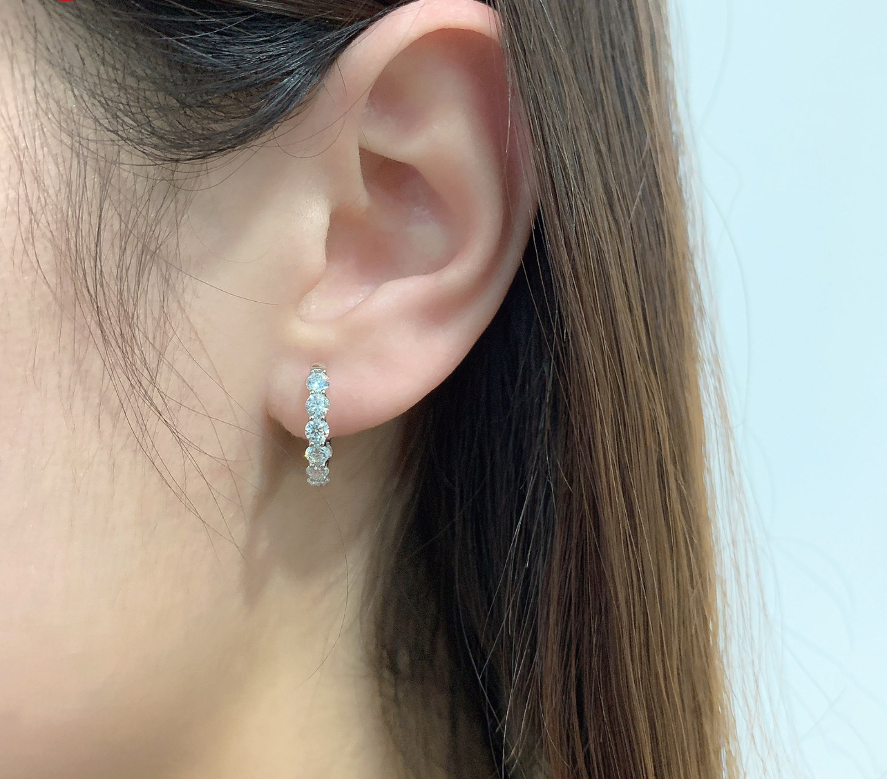 Acești cercei cu stralucirea radiantă sunt realizați din aur de 10K, 14K sau 18K, fiind imbracati in 20 de moissanite de culoare D, claritate VVS1, avand un total de 0,6 carate, fiecare piatra 0,2 mm ( 0,03 CT). Diametrul cerceilor este de 13 mm.