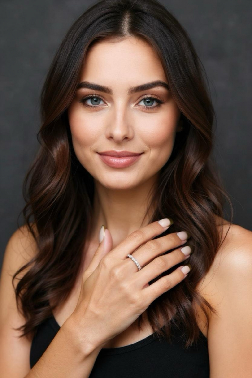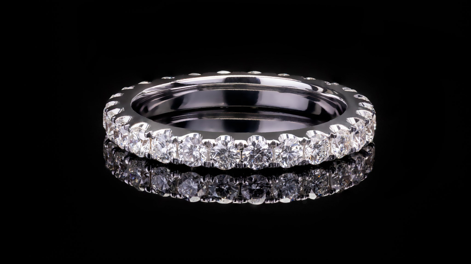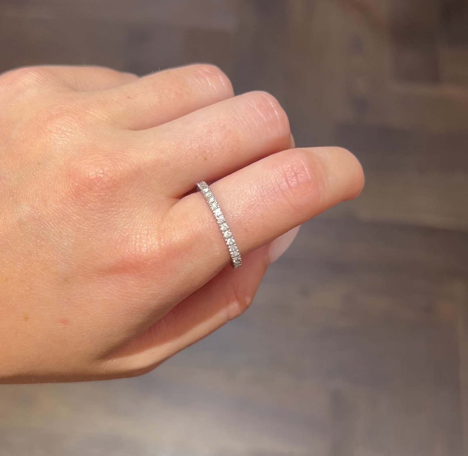 Acest inel eternity este o expresie atemporală a eleganței, realizat cu măiestrie din argint 925, aur sau platină – la alegere – pentru a se potrivi perfect stilului tău personal. Montura delicată, cu lățimea de doar 2 mm, este împodobită în întregime cu diamante de laborator de aproximativ 1 carat, cu o culoare F (aproape incoloră) și claritate VS1 – o combinație care oferă o strălucire impecabilă și rafinament absolut.