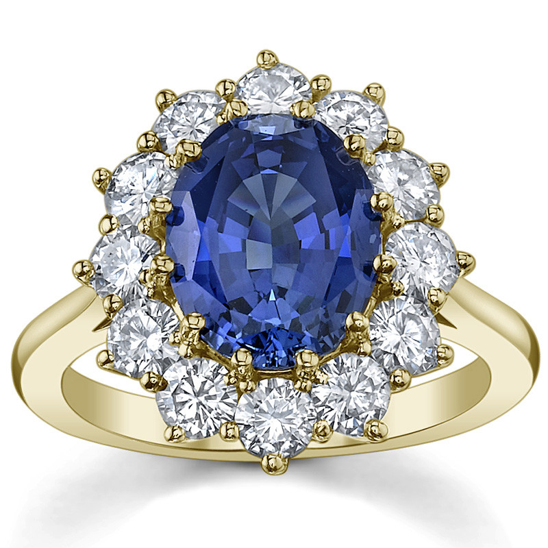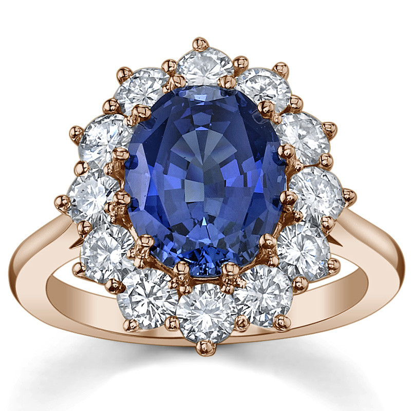 Piatra centrală este un safir albastru de laborator de 2,5 carate, înconjurat de un halo strălucitor de diamante de laborator ce reflectă lumina superb și oferă un contrast spectaculos.