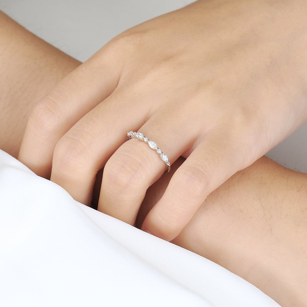 Elegant și rafinat, acest inel semieternity este realizat din aur de 10K, 14K, 18K sau platina, oferind un luciu nobil și o rezistență excelentă în timp. Împodobit cu diamante cultivate in laborator de 0,4 ct în total, de culoare E-F și claritate VS, inelul combină tăieturi marquise și rotunde într-un joc echilibrat de forme și străluciri. Pietrele sunt așezate cu grijă într-o montură delicată, evidențiind frumusețea fiecărei fațete.
