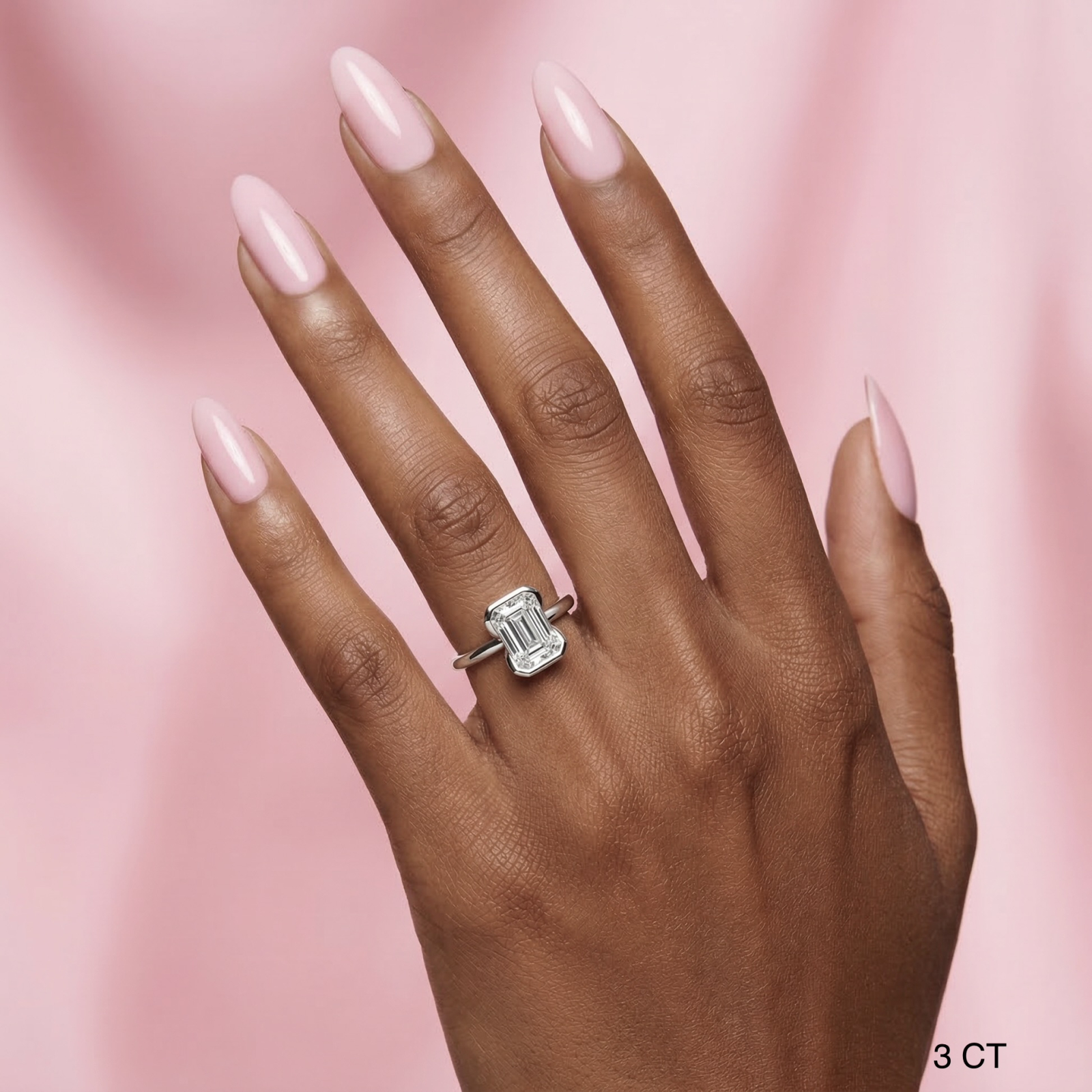 - Center stone: 1.5 ct lab-grown diamond, emerald cut