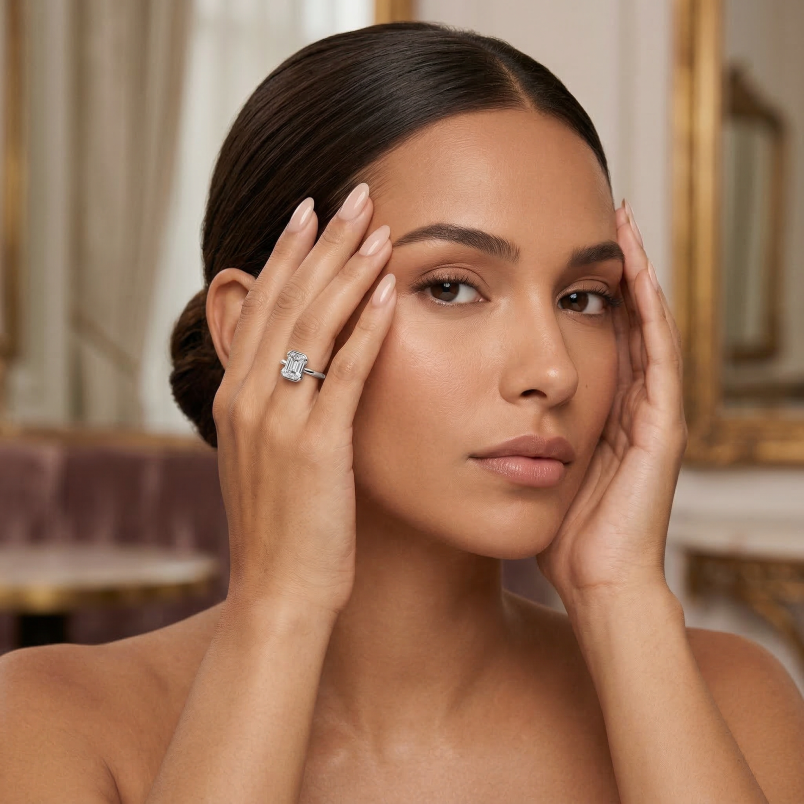 Elegant and sophisticated – this engagement ring showcases the exquisite beauty of the emerald cut. Set with a stunning 1.5-carat center stone, the lab-grown diamond has exceptional clarity and brilliance. Surrounding it, a hidden halo of 20 round diamonds adds a subtle yet dramatic effect of light and depth. The 4-prong setting maintains a minimalist and clean design, letting the center stone take center stage.