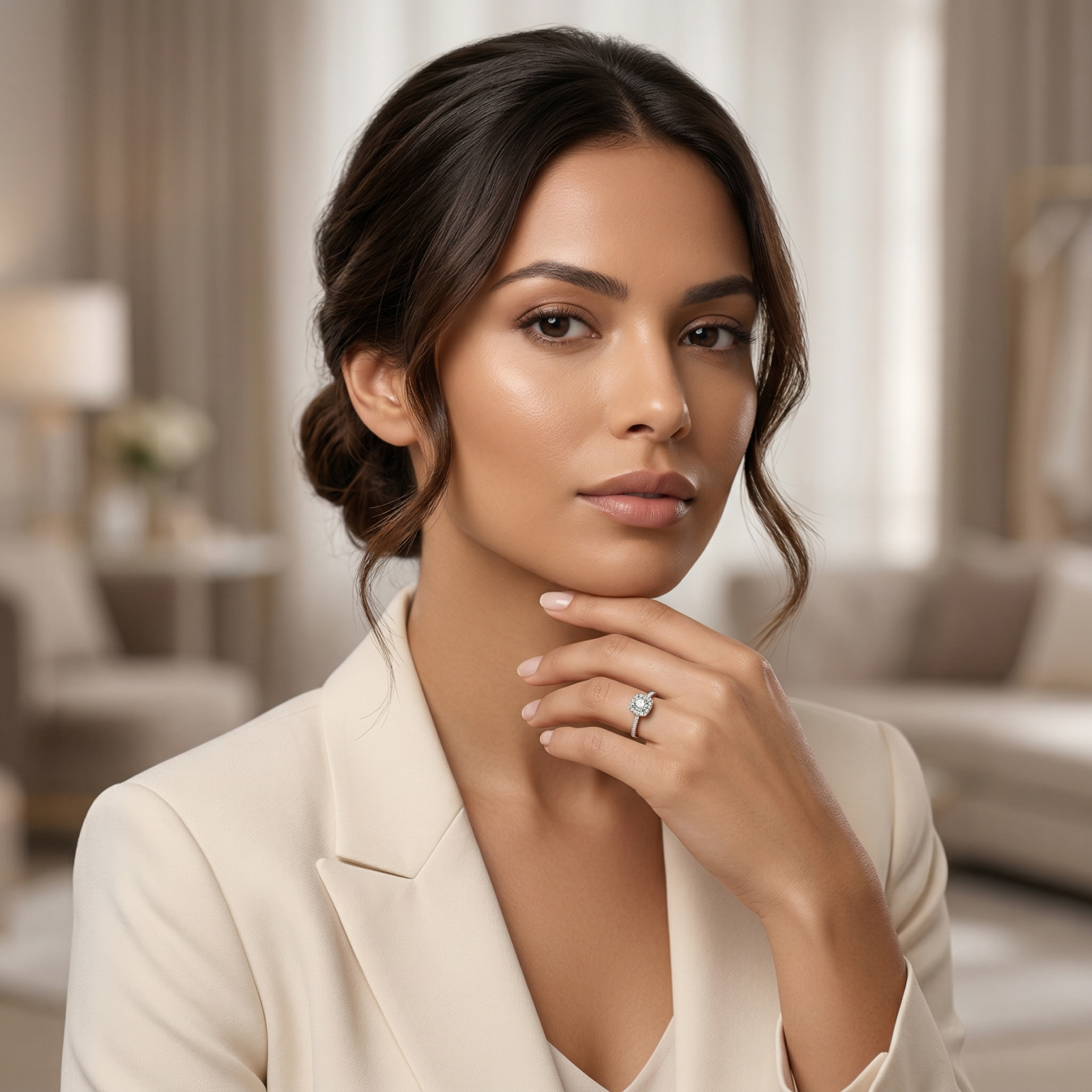 Exquisite Halo Design: The halo of accent stones adds extra sparkle and dimension, enhancing the overall brilliance of the ring. All stones in this ring are D-color, VVS1 clarity moissanite, totaling approximately 0.9 CT.
