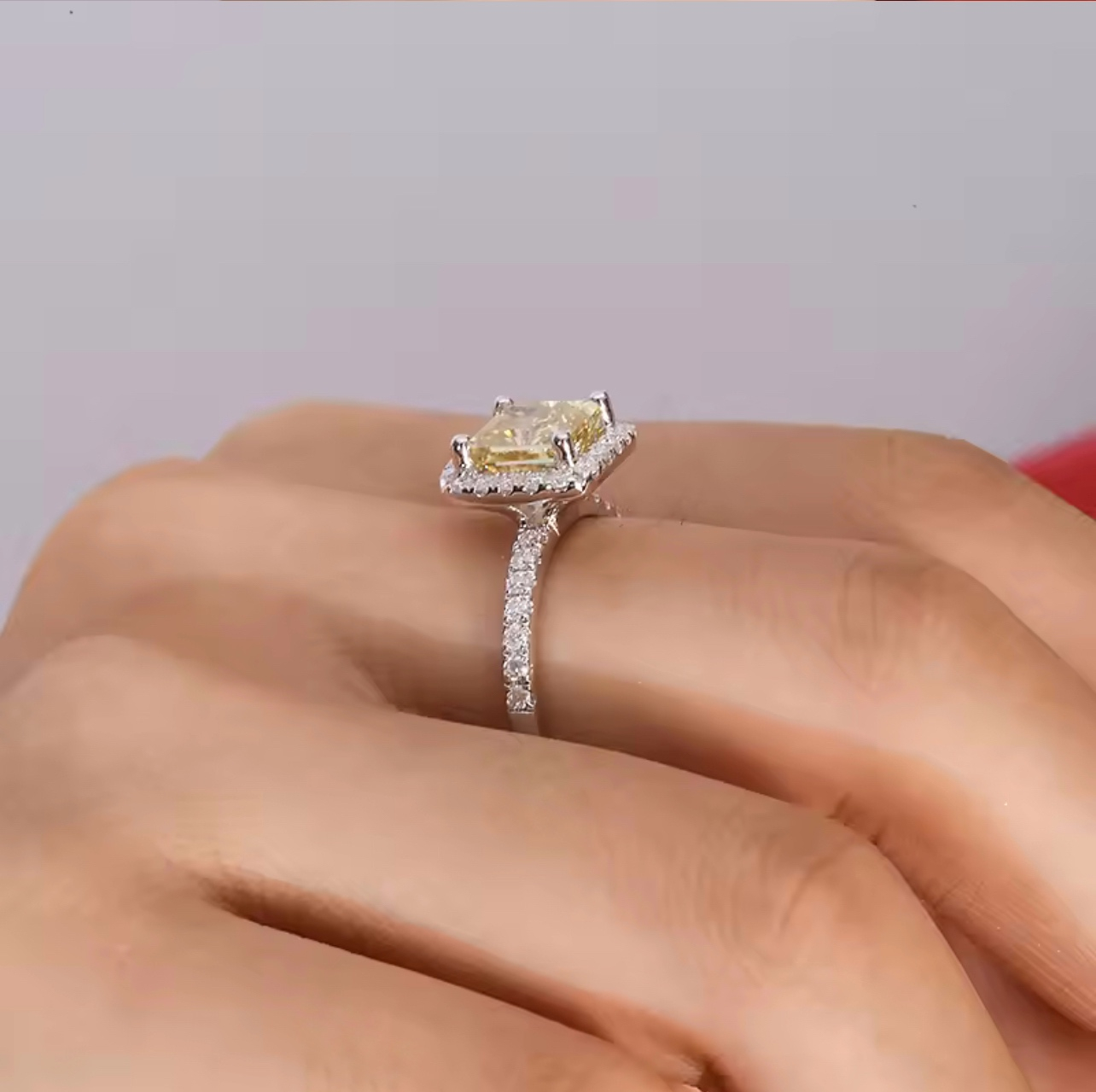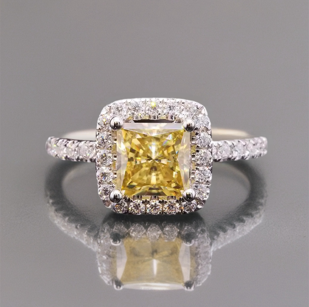 Acest inel spectaculos este piesa statement perfectă pentru o apariție elegantă și îndrăzneață. Piatra centrală este un diamand de laborator fancy yellow de 1 sau 2 carate, cu tăietură princess, montat cu grijă în gheare fine, care îi accentuează nuanța vibrantă. În jurul acestei pietre captivante, un halo de diamante rotunde, tăietura brilianta, adaugă un plus de strălucire, continuând și pe bandă în stil pavé, pentru un efect spectaculos din orice unghi.
