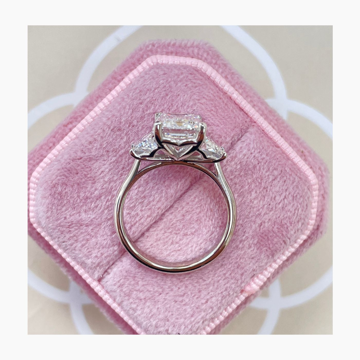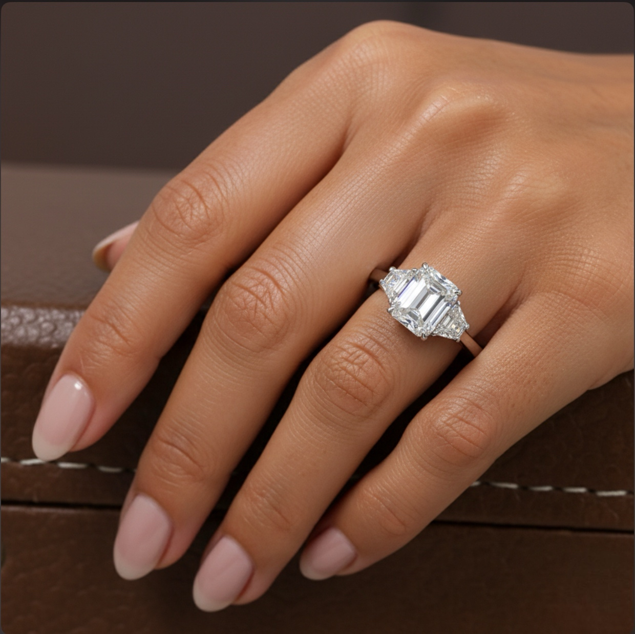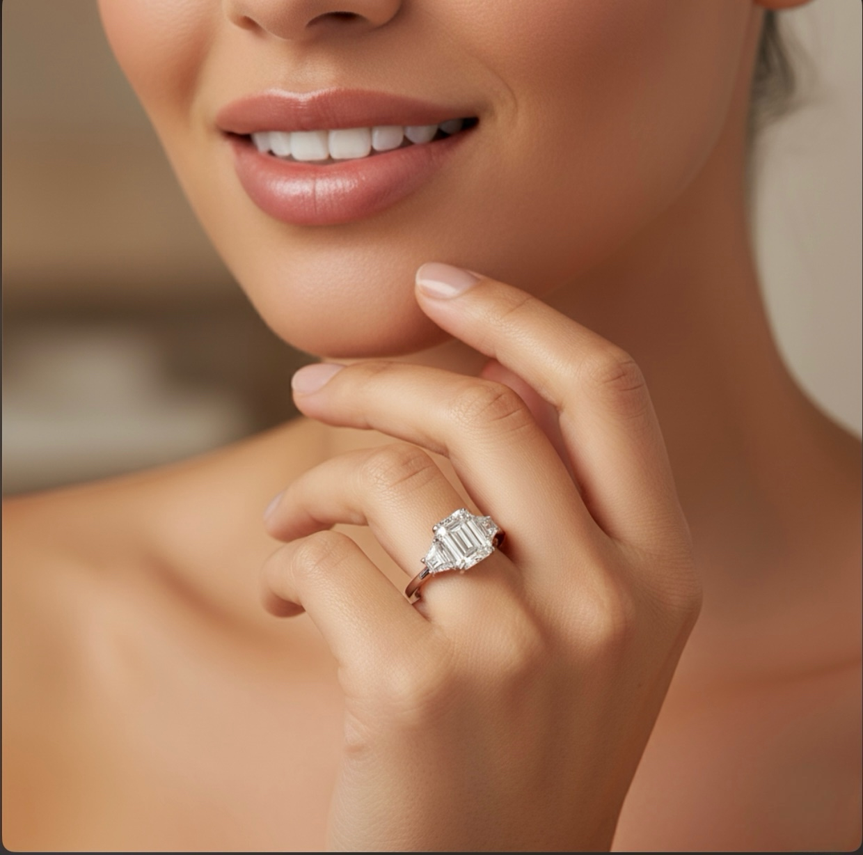 Piatra centrală, un diamant de laborator de 2 carate, tăietură Emerald, fascinează prin claritatea sa geometrică și reflexiile limpezi care amintesc de oglinzi de lumină pură. Două diamante laterale de 0,4 carate fiecare completează perfect designul, adăugând profunzime și simetrie.