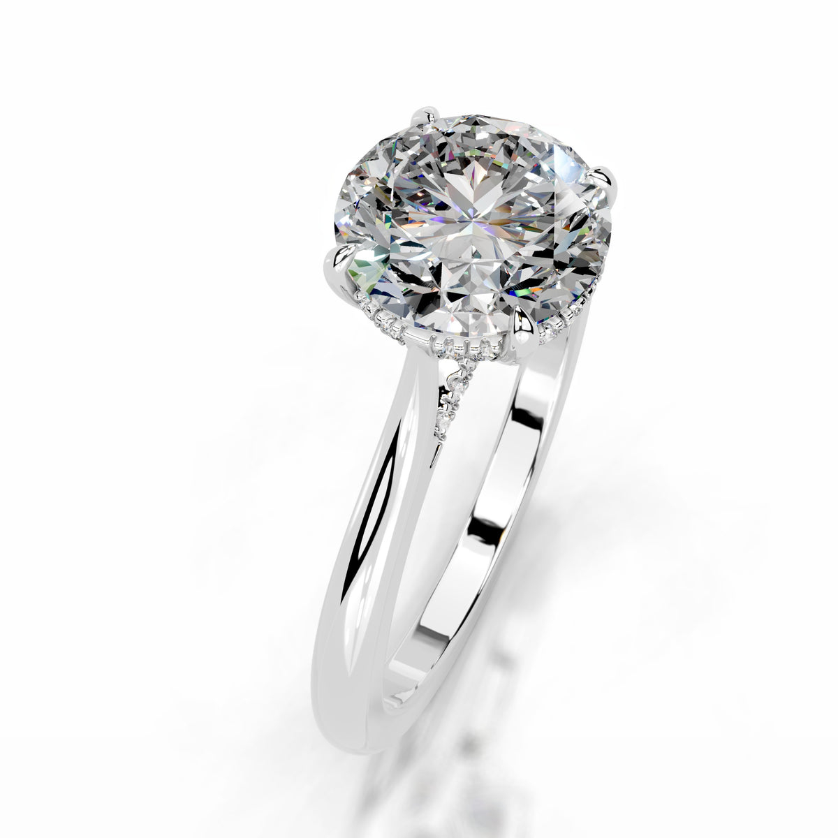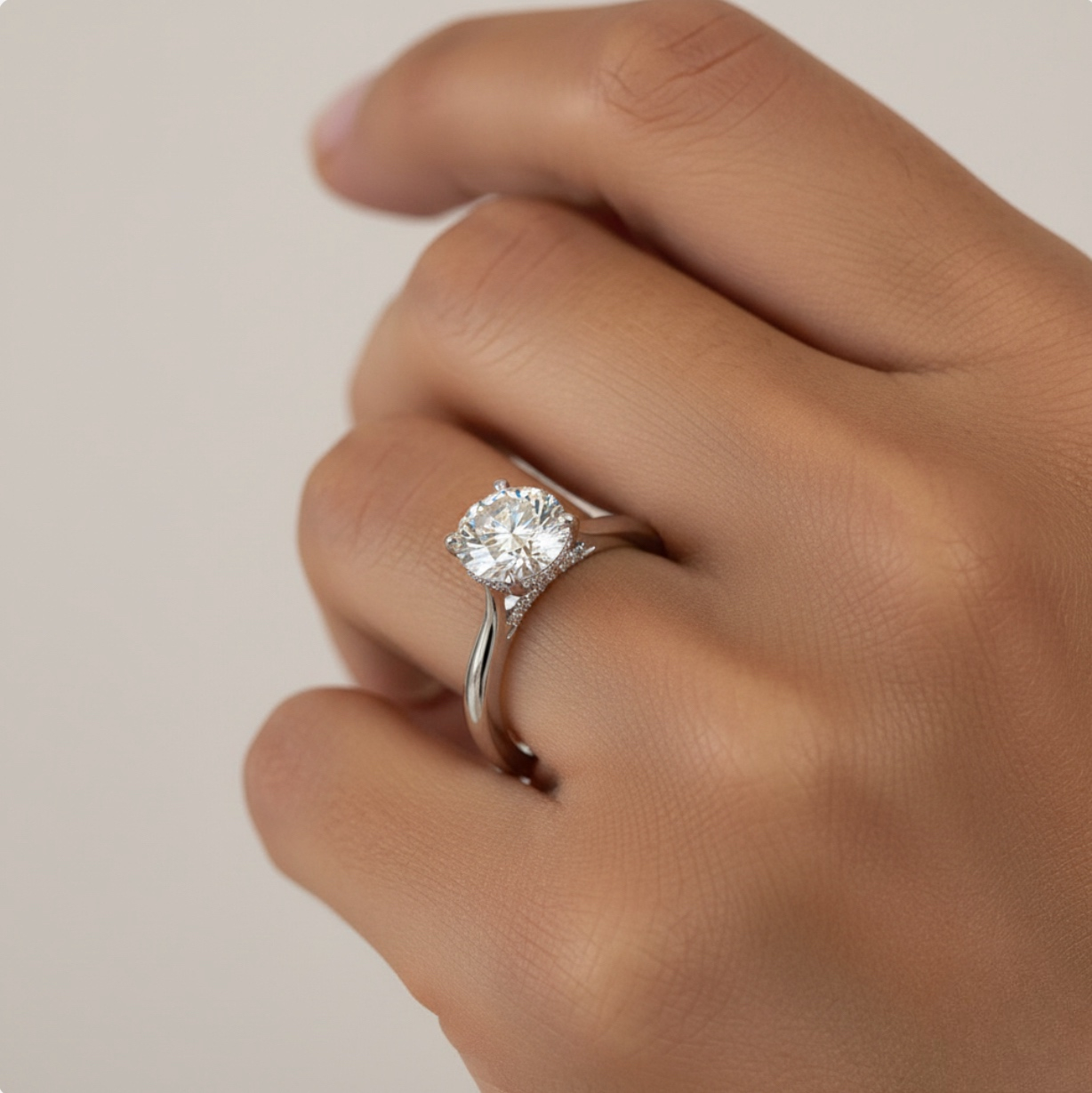 Un simbol al rafinamentului absolut, acest inel strălucește cu o eleganță cladica. Piatra centrală este diamant de laborator tăietură rotundă briliantă ce este pusă în valoare de o setare înaltă cu patru gheare, care permite luminii să pătrundă din toate unghiurile, amplificându-i focul și claritatea. Sub piatra principală se ascunde un halo discret de diamante, iar banda subțire de 2 mm, împodobită cu mini pave fin, completează perfect designul sofisticat.