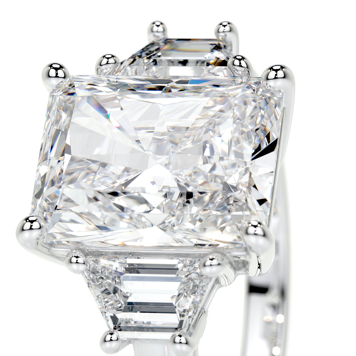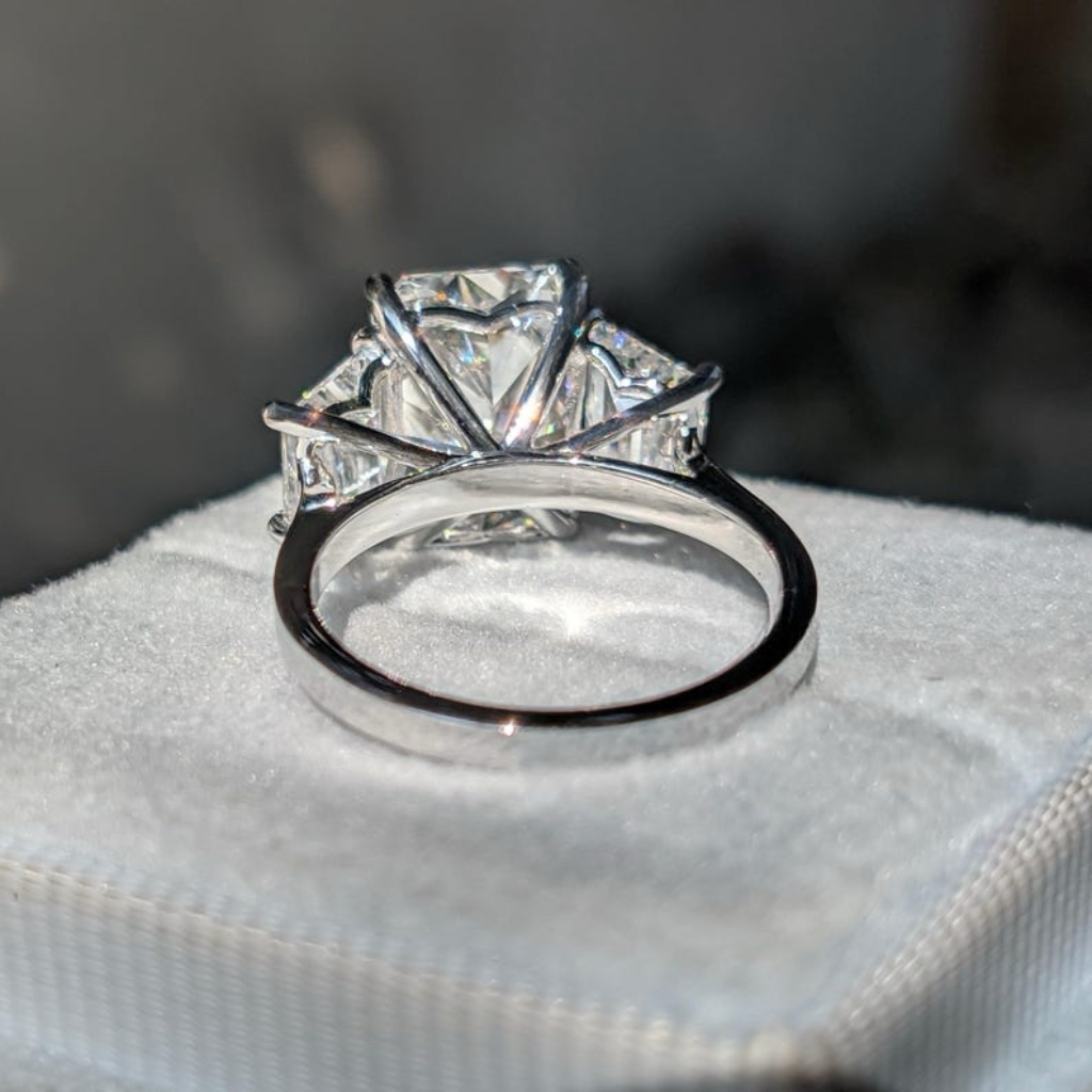 De-o parte și de alta, două diamante tăietură Trapezoidală, de 0,5 ct, adaugă un accent sofisticat și o tranziție grațioasă între piatra centrală și banda elegantă.
