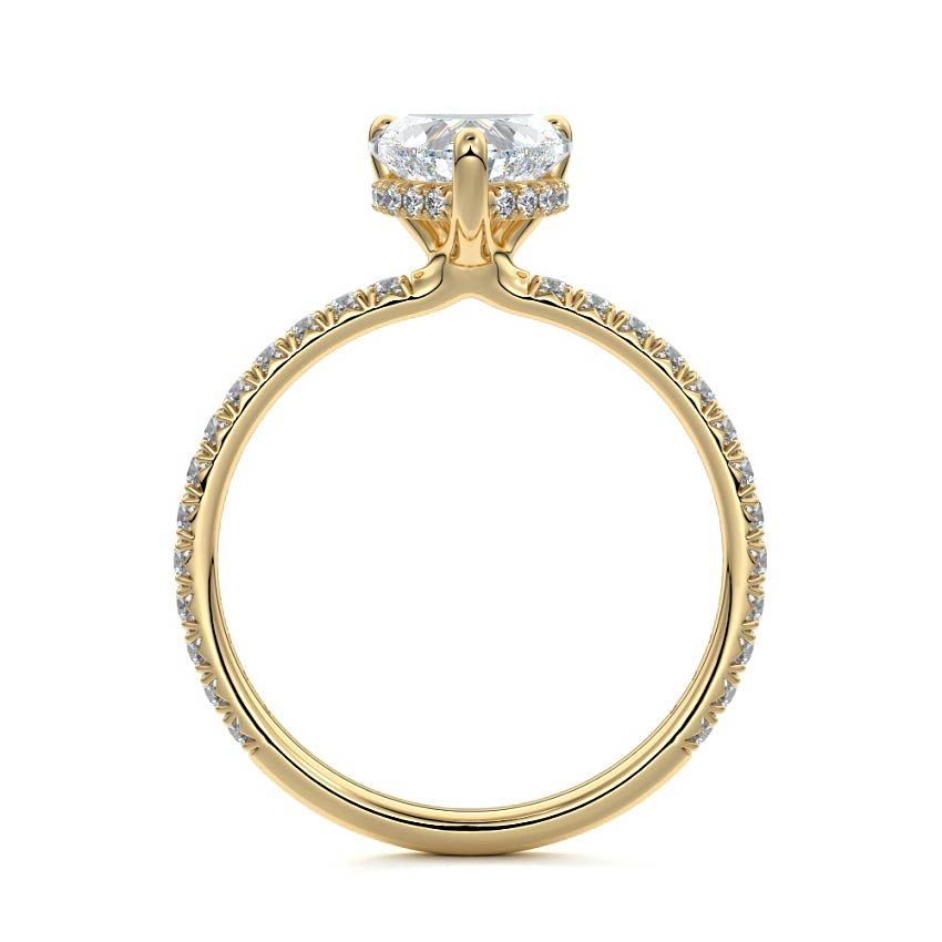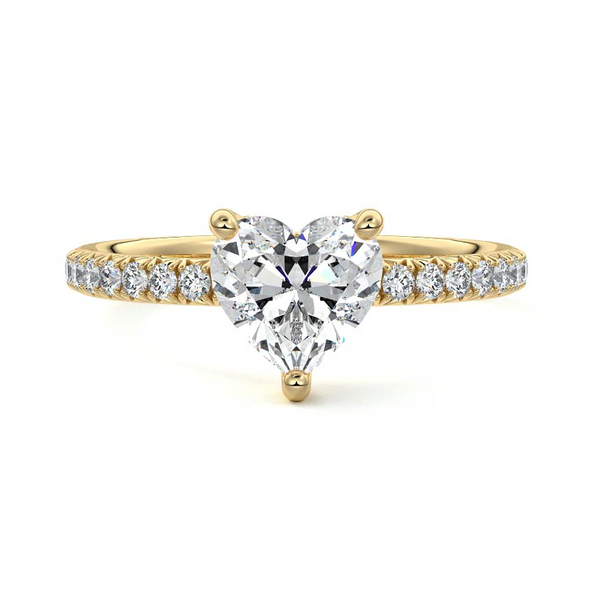Simbol al iubirii autentice, acest inel din aur de 10K, 14K sau 18K îmbină designul rafinat cu emoția pură. Piatra centrală de 1 carat, tăiată în forma romantică Heart (inima), strălucește cu intensitate în nuanța perfectă D și claritate VVS, amintind de cele mai prețioase momente ale inimii.