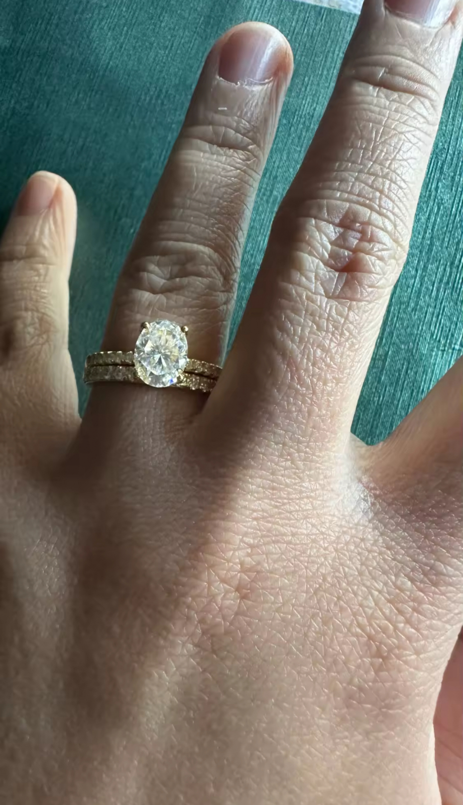 - Piatra centrală: Moissanite de 1 carat, tăietură ovală, culoare D, claritate VVS