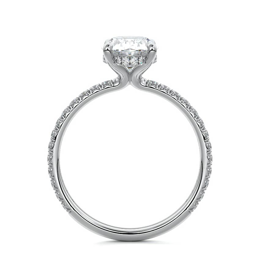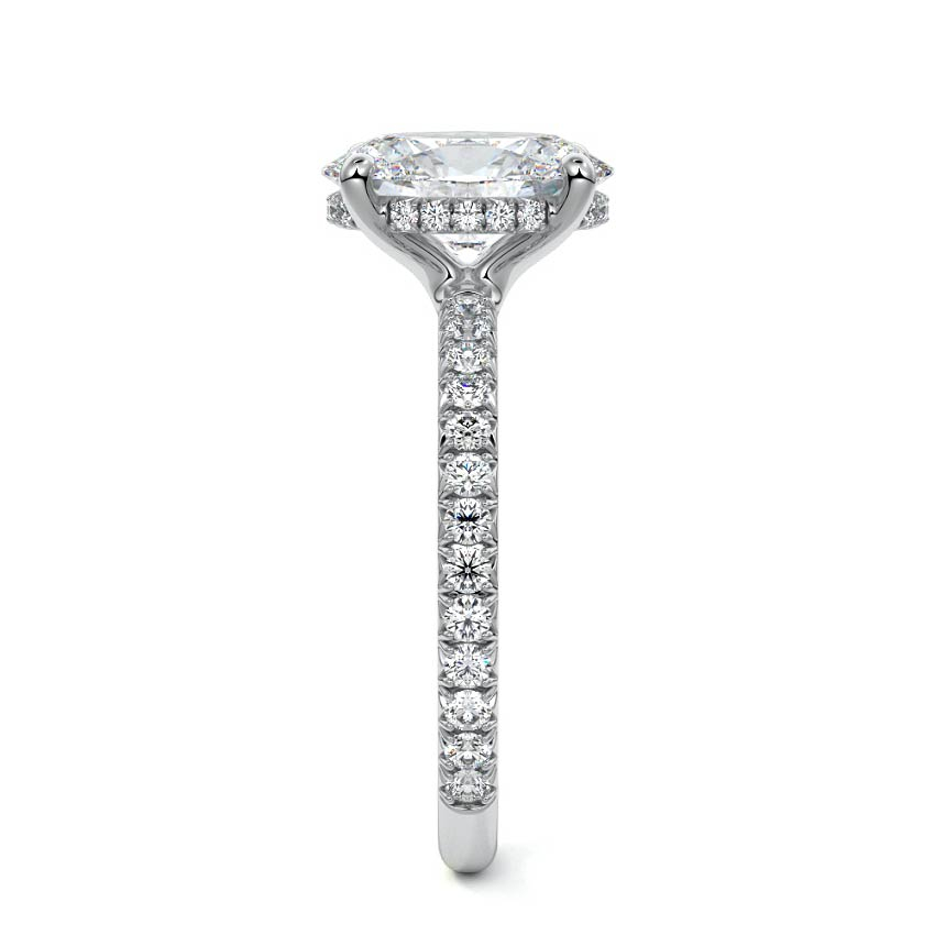 Un halo ascuns înconjoară discret piatra, adăugând un joc spectaculos de lumini văzut din unghiuri neașteptate. Banda inelului este împodobită cu moissanite pavé de 0,4 CT, fiecare montată cu grijă pentru a adăuga profunzime și rafinament.