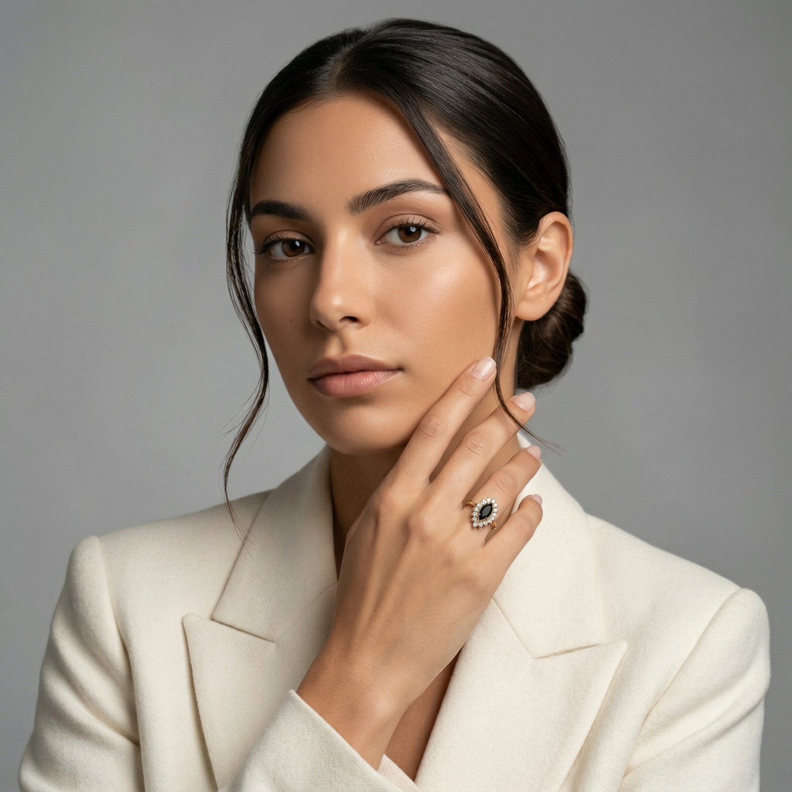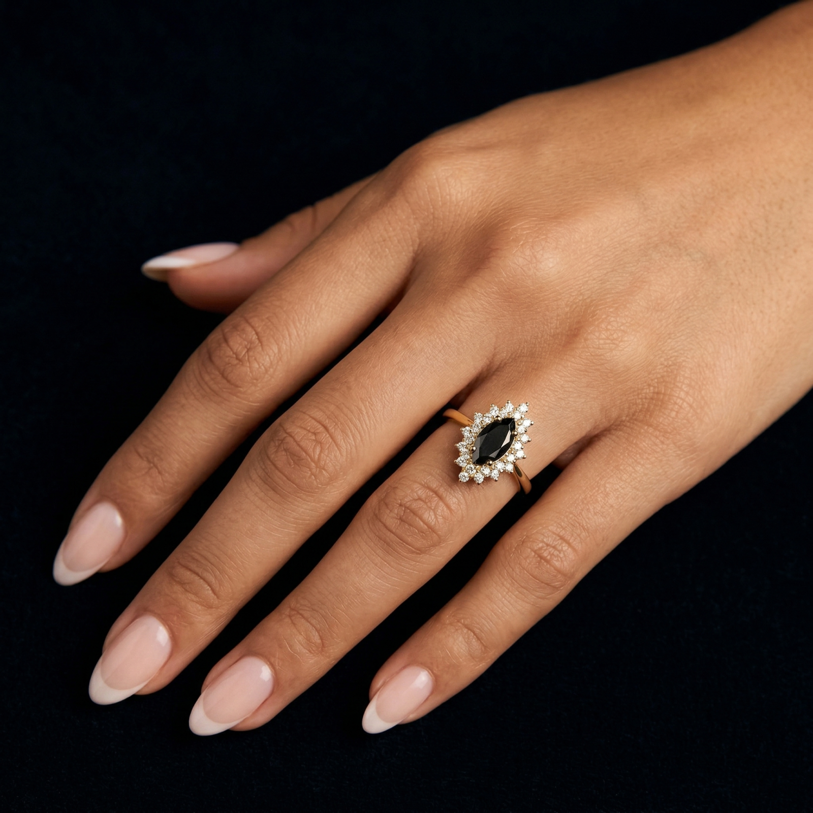 Designul îmbină armonios contrastul dintre moissanite-ul negru și strălucirea albă a pietrelor secundare, oferind un aspect modern, dar cu influențe vintage. Acest inel cu moissanite marquise este realizat din aur sau platină și poate fi personalizat, fiind ideal atât ca inel de logodnă deosebit, cât și ca bijuterie statement.