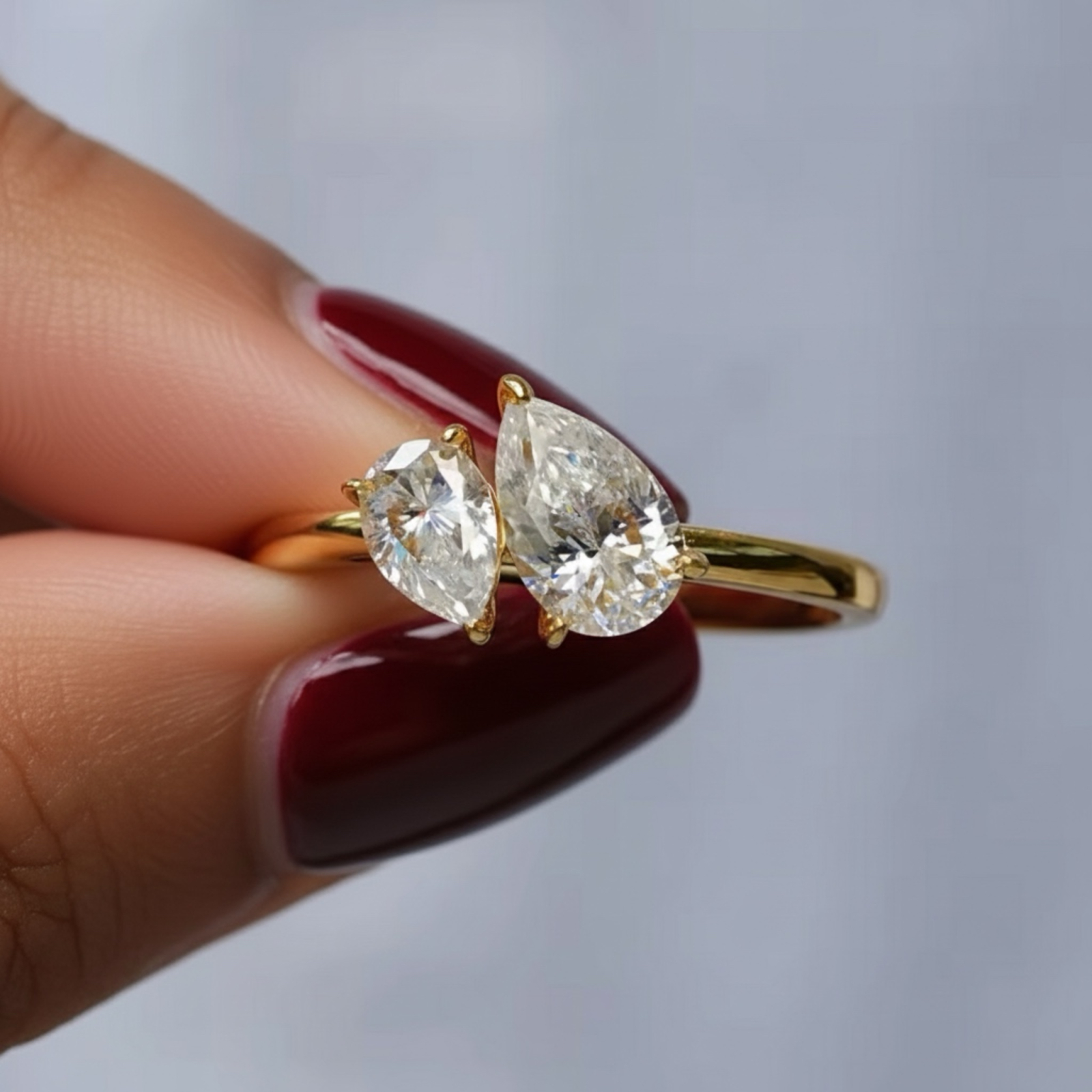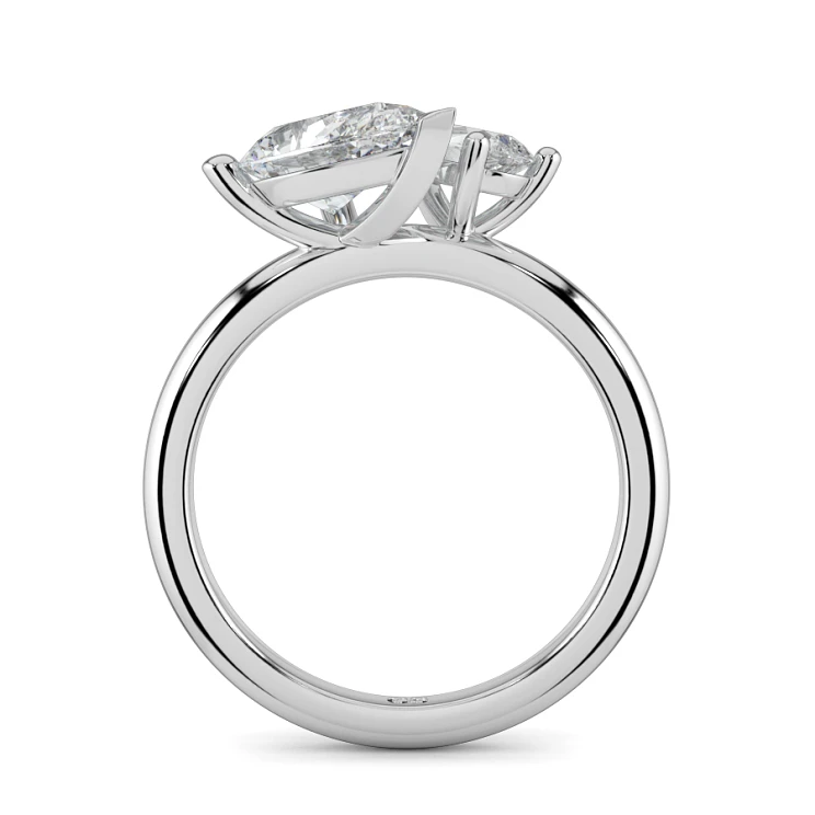Piesele centrale sunt două moissanite premium în tăietură pară: o piatră de 1 carat și una de 0,5 carate, ambele în culoare D și claritate VVS – o strălucire impecabilă ce rivalizează cu diamantul. Montura elegantă în 3 gheare scoate în evidență fiecare piatră, oferind o notă sofisticată și modernă.