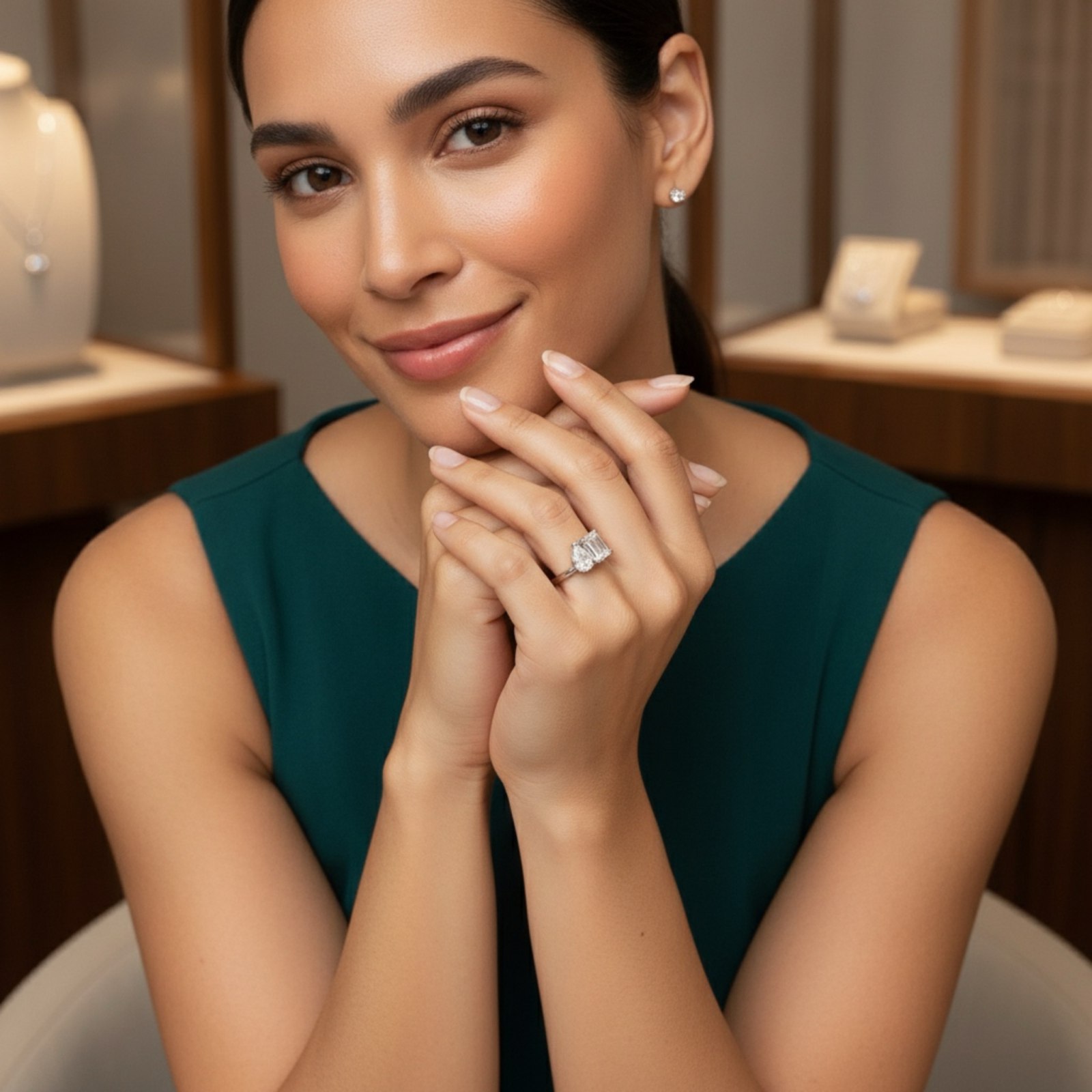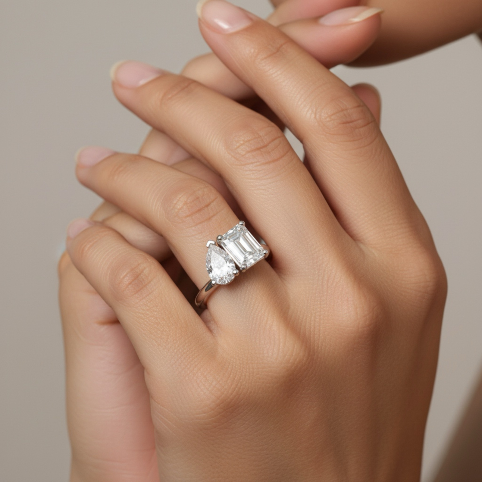 - Pietre centrale: Moissanite tăietură emerald și pară