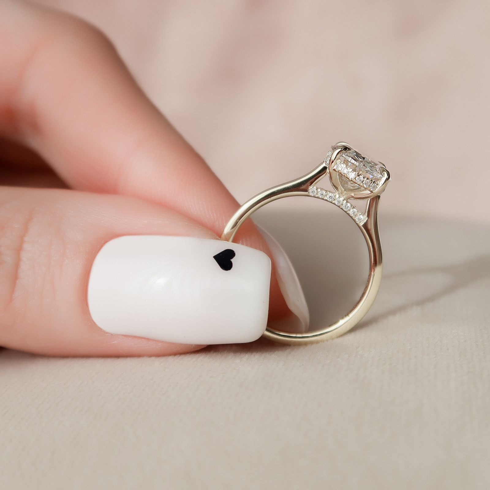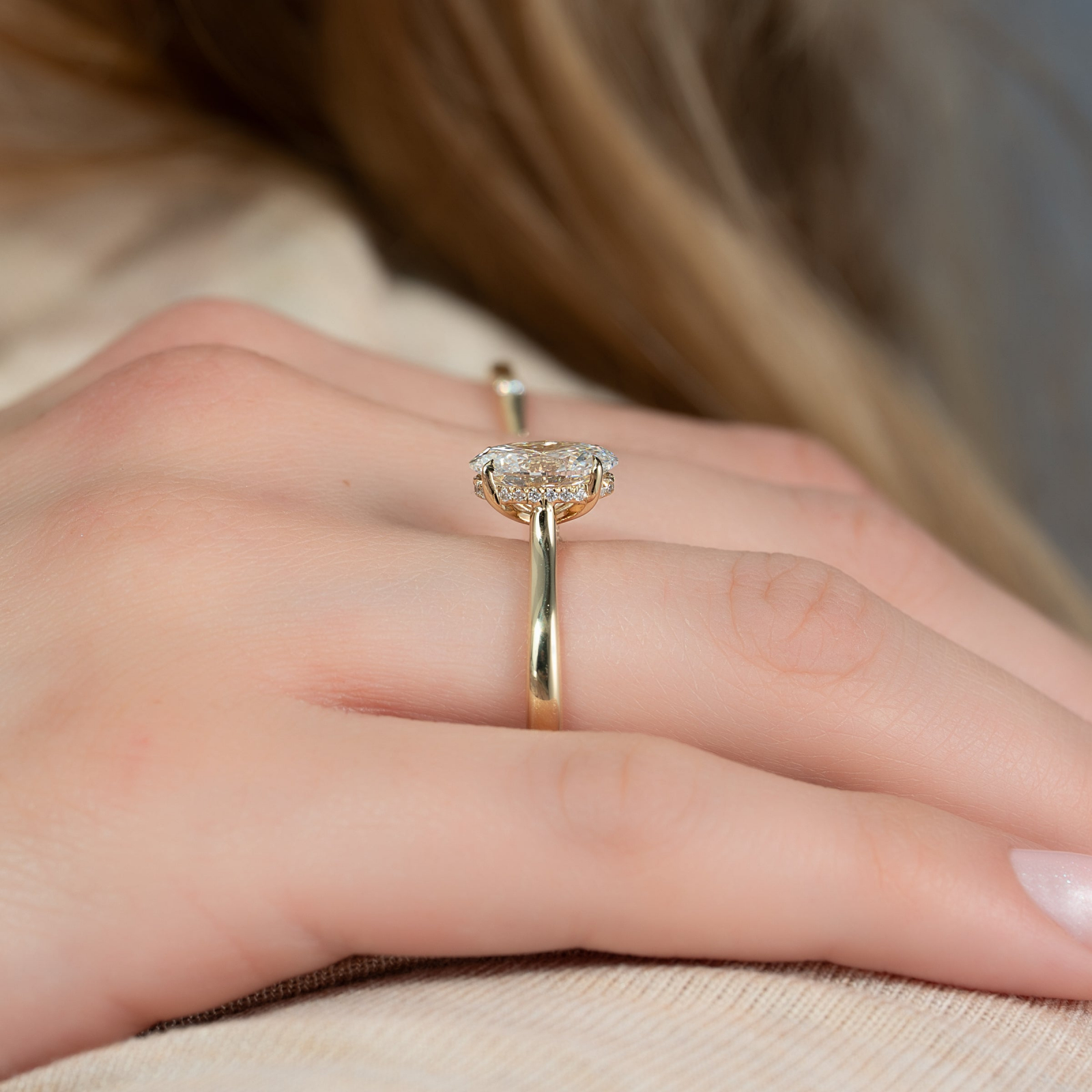 Piatra centrală, un diamant de laborator oval taietura brilianta, este evidențiată de o montură înaltă cu 4 gheare, care permite luminii să pătrundă din toate unghiurile, amplificând focul și claritatea excepțională. Cu culoare E și claritate VS1, oferă un aspect impecabil și o transparență de top.