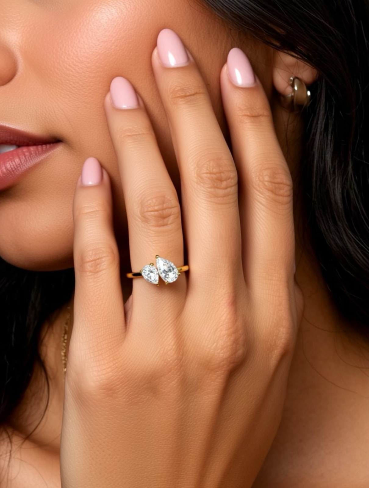 Inelul este împodobit cu două diamante de laborator de culoare E-F și claritate VVS, în tăietură pară – una de 1 carat și cealaltă de 0,5 carate.