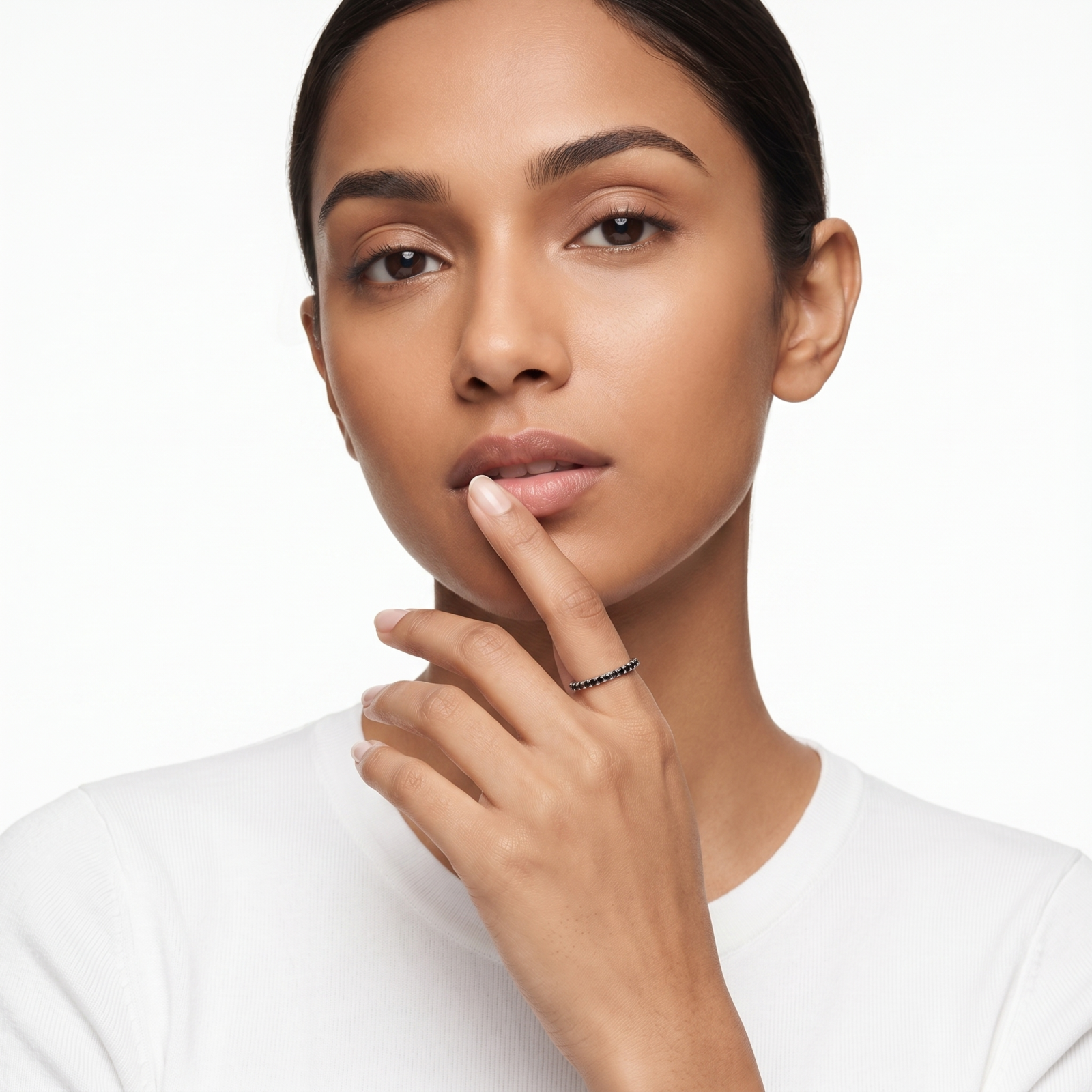 Designul tip eternity, cu pietre dispuse continuu pe întreaga bandă, creează un efect spectaculos de strălucire profundă, în timp ce nuanța intensă a moissanite-ului negru oferă un contrast luxos și contemporan. Este alegerea ideală pentru cele care caută un inel fin, minimalist, dar cu impact vizual puternic.