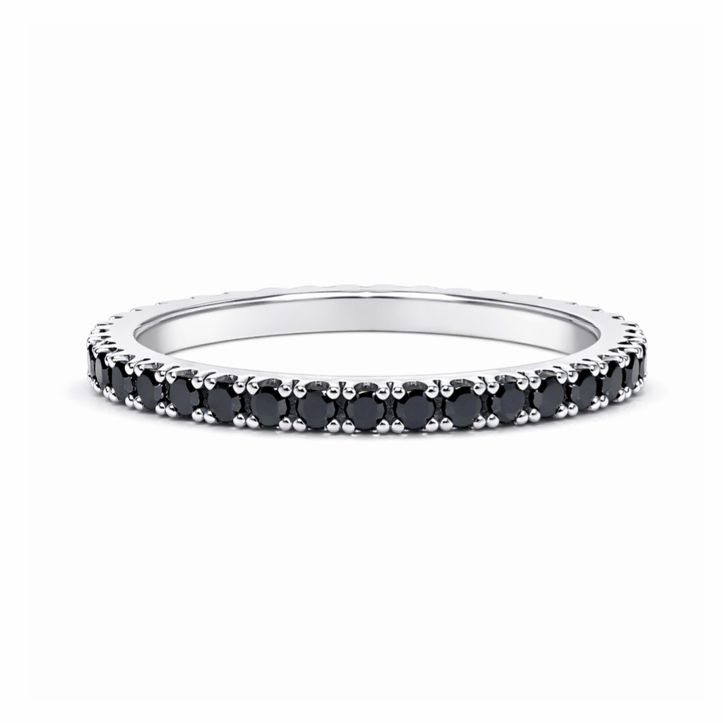 Inel eternity cu moissanite negre, realizat din argint placat cu platină sau aur galben/rose – o piesă modernă, sofisticată și extrem de căutată pentru femeile care vor un inel elegant diferit de clasicul diamant alb.