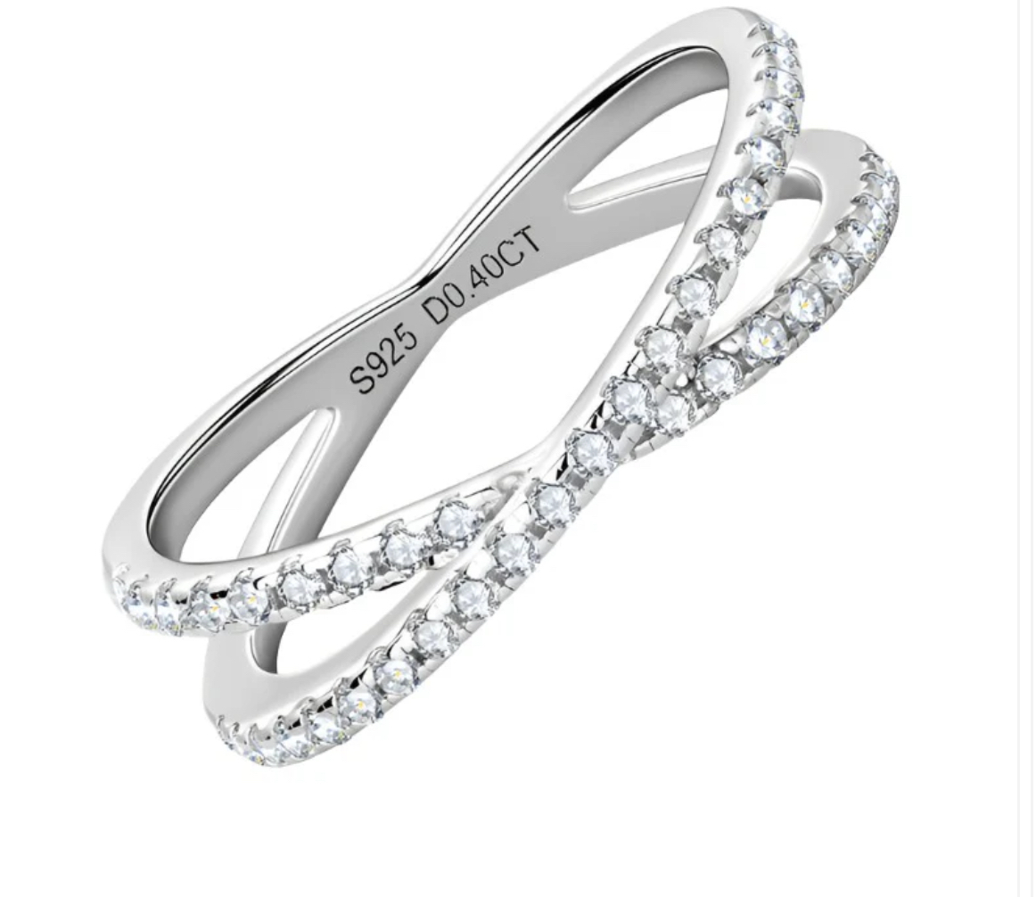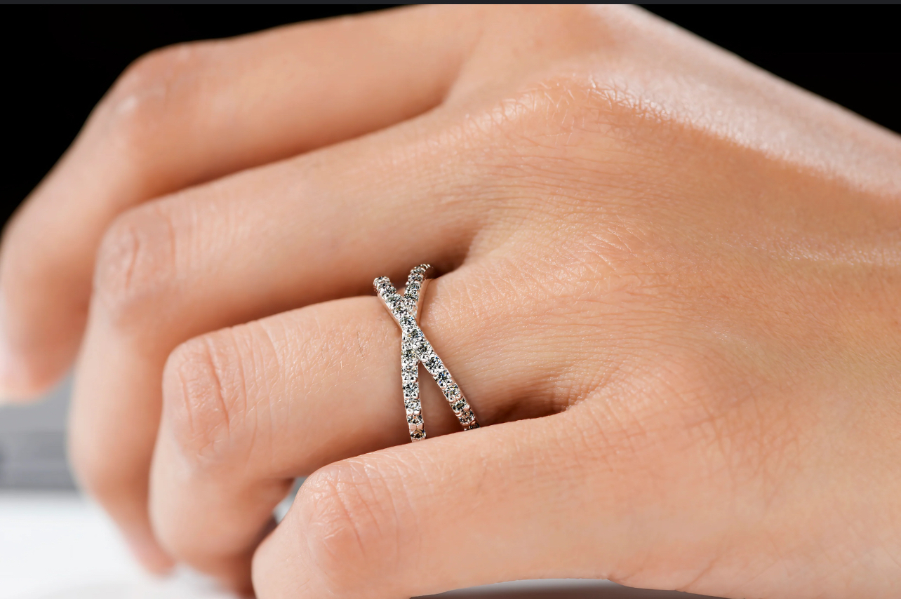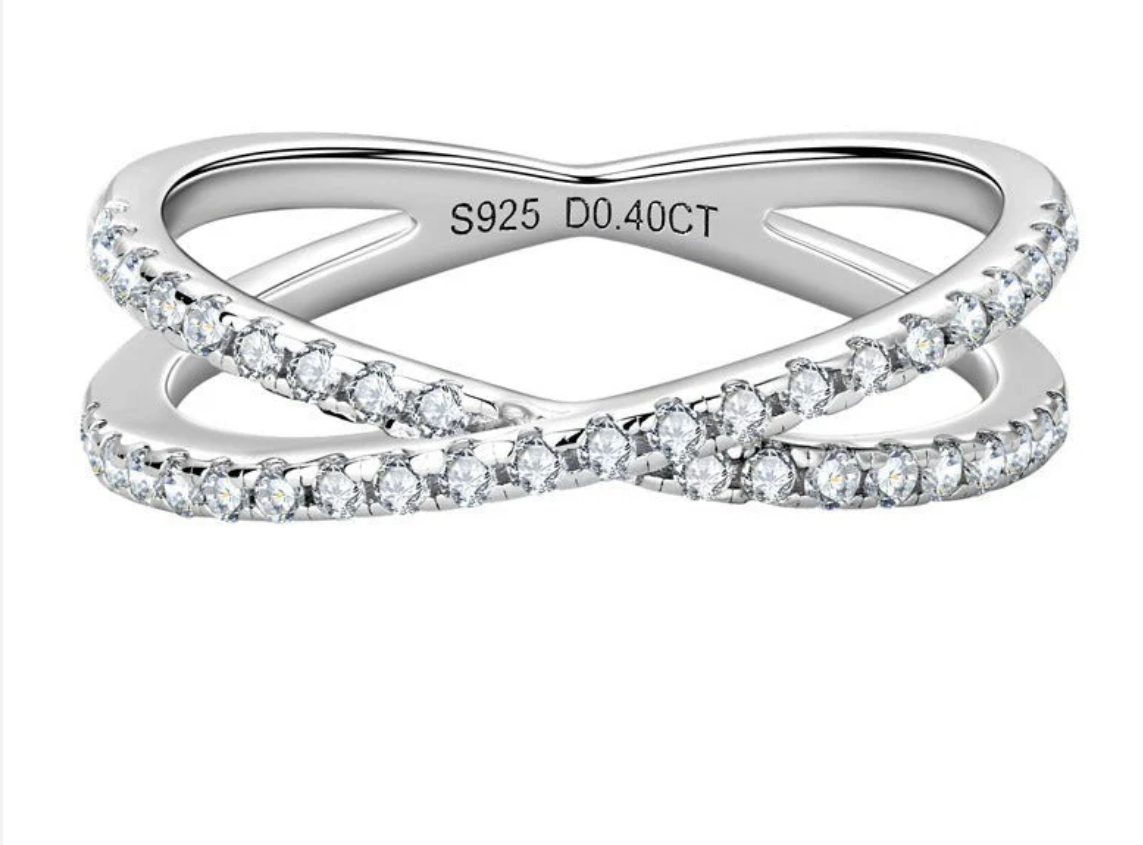 • Distins prin forma sa unică X Cross, acest inel împletește eleganța cu stilul contemporan, prezentând pietre moissanite de 0,4 carate pe partea frontală pentru un plus de strălucire.