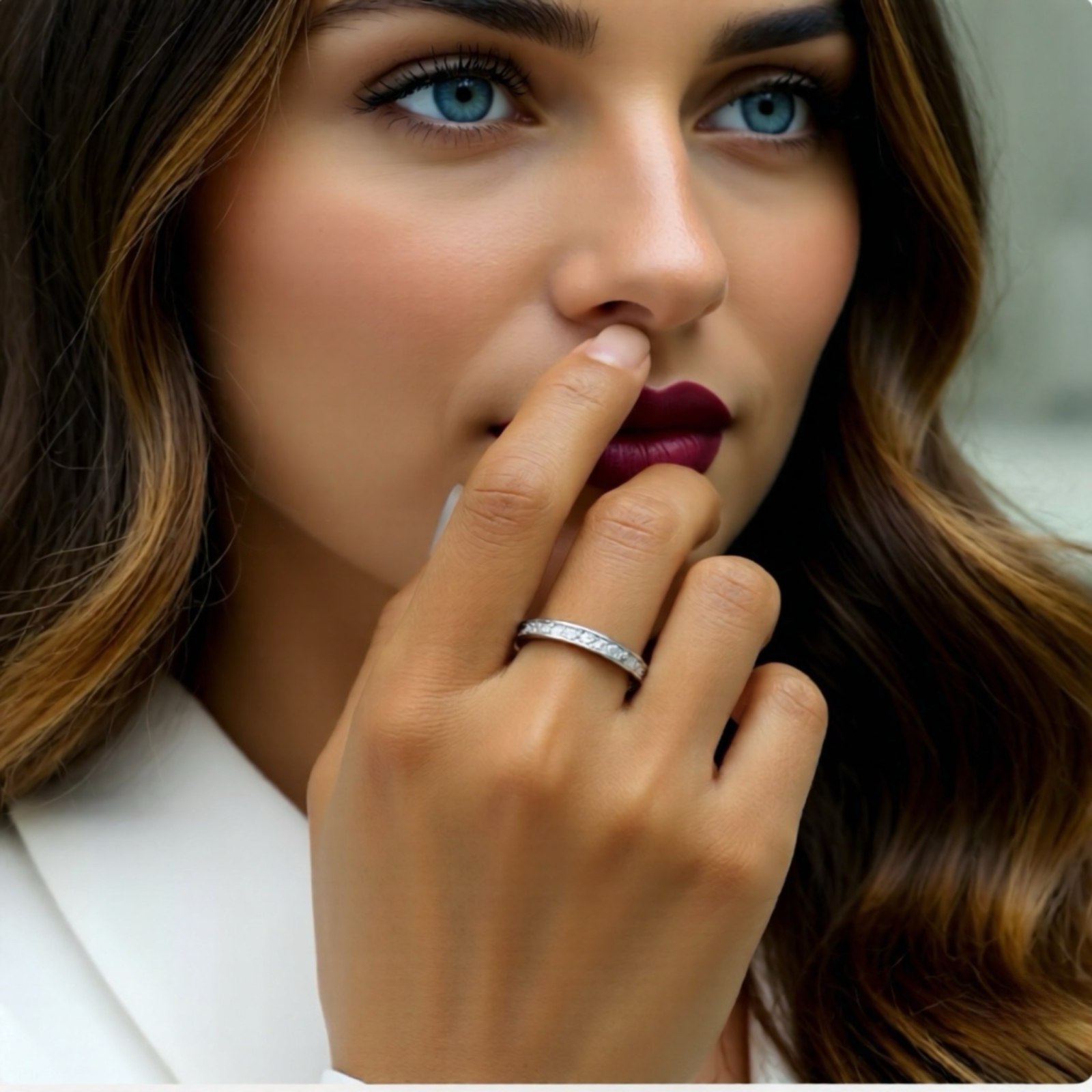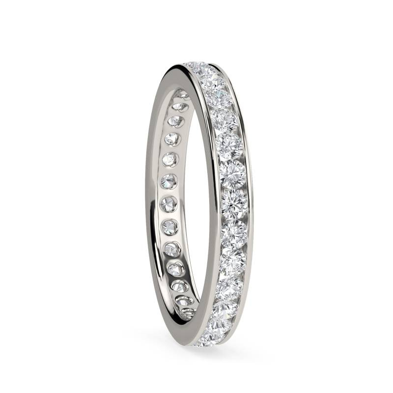 Acest inel eternity este realizat cu precizie și echilibru perfect între eleganță și strălucire. Fiecare moissanite de 2 mm, de culoare D și claritate VVS, este montat într-o setare channel fin lustruită, care pune în valoare focul și claritatea pietrelor.