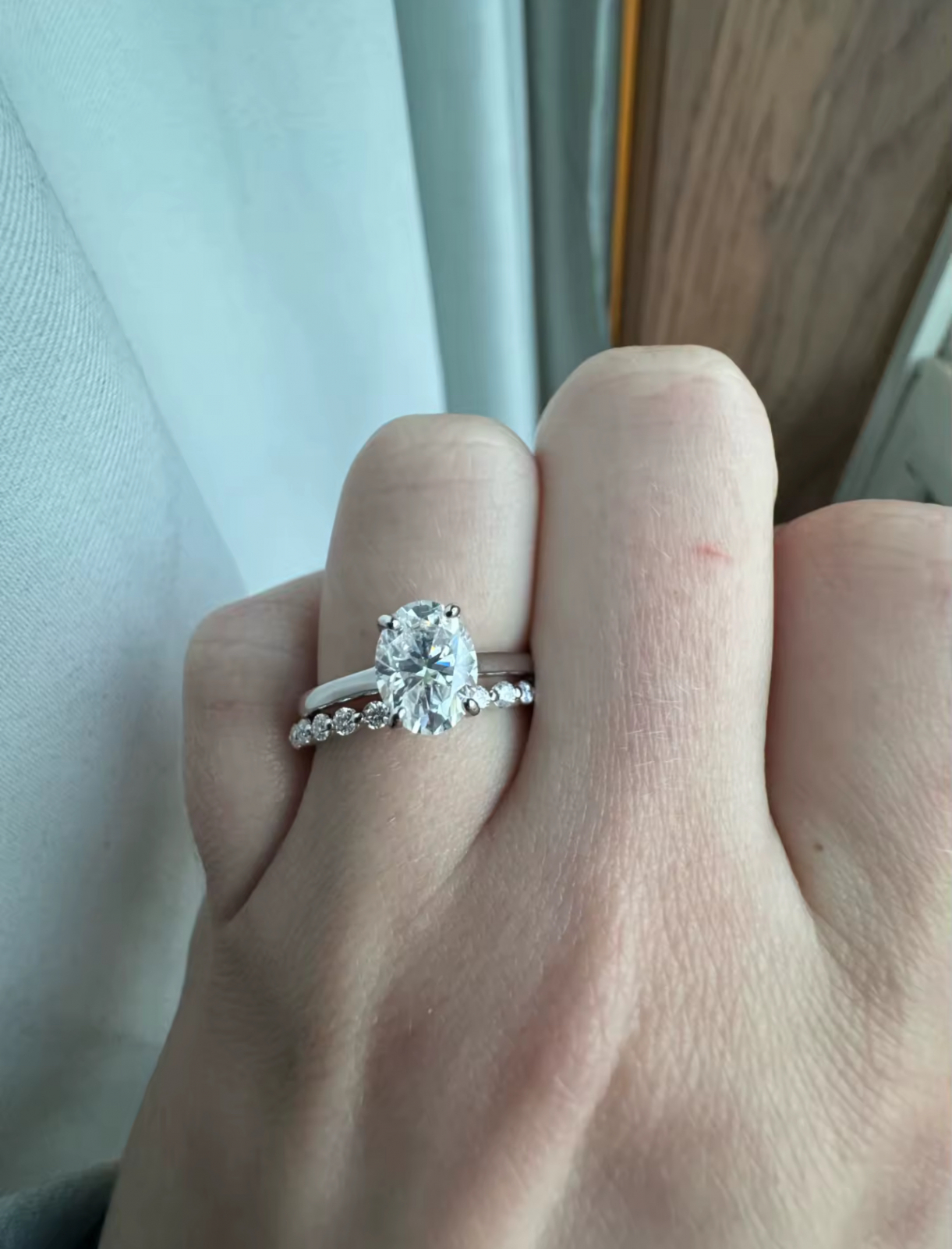 - Pietre: Moissanite premium, culoare D, claritate VVS, de 2,5 mm