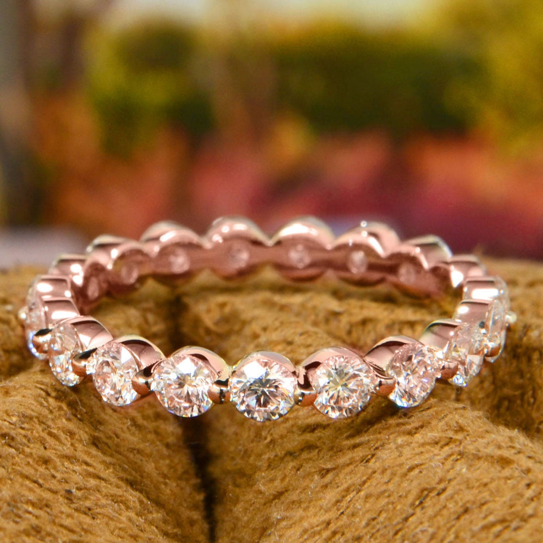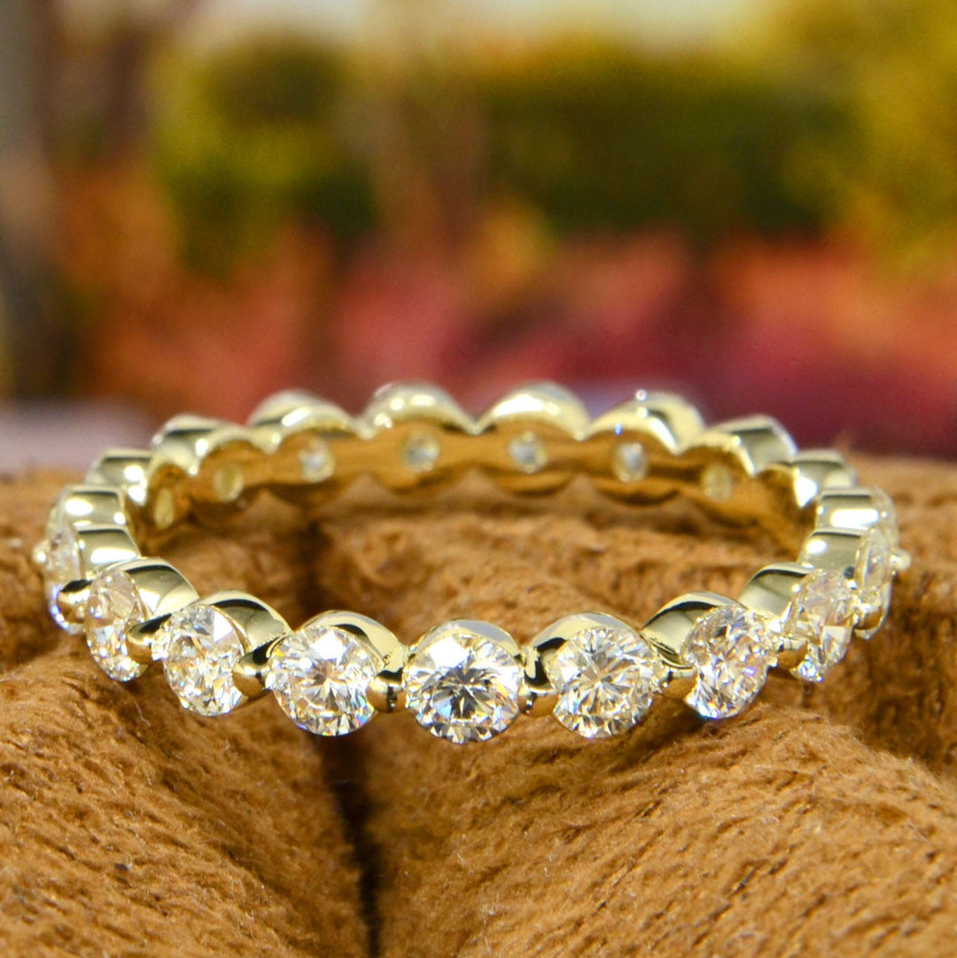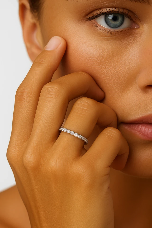 Acest inel eternity impresionează prin eleganța sa clasică și detaliile impecabile. Împodobit cu moissanite premium de culoare D și claritate VVS, cu o greutate totală de aproximativ 1,5 carate, oferă o strălucire intensă și puritate remarcabilă. Fiecare piatră este atent montată pentru a crea un efect vizual spectaculos din orice unghi.
