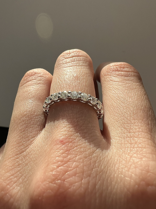 Acest inel rafinat este o adevărată capodoperă, concepută pentru a captiva cu pietrele sale stralucitoare, moissanite de 0,1 carat fiecare in parte, avand in total aproximativ 2,1 carate. Fiecare moissanit strălucește cu o strălucire uimitoare, evidențiind focul și alura acestui inel meticulos lucrat.