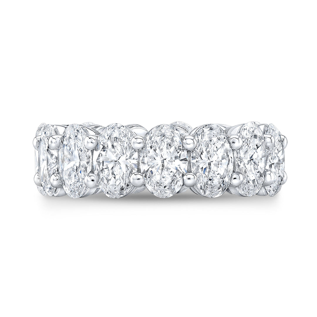 Moissanitele, cu culoare D și claritate VVS, sunt montate continuu pe toată banda inelului, fiecare piatră fiind tăiată cu precizie în stilul oval, pentru a oferi o strălucire deosebită. Argintul placat cu platina conferă inelului o finisare luxoasă și durabilă, menținându-l impecabil de-a lungul timpului.