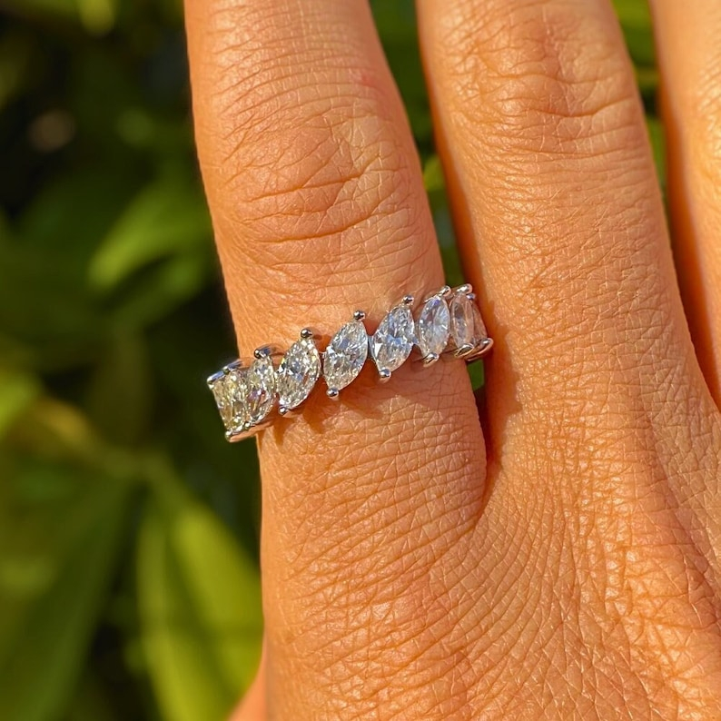 Moissanitele, cu culoare D și claritate VVS, sunt montate continuu pe toată banda inelului, fiecare piatră fiind tăiată cu precizie în stilul marquise, pentru a oferi un efect de alungire elegant și o strălucire deosebită. Argintul placat cu platina conferă inelului o finisare luxoasă și durabilă, menținându-l impecabil de-a lungul timpului.