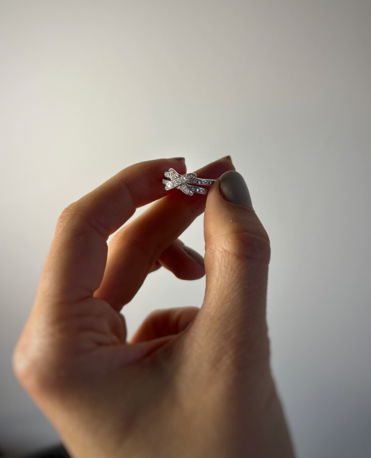 Un simbol al eleganței rafinate, acest inel delicat este realizat din argint 925 placat cu platină, și decorat cu moissanite rotunde briliant de 1,5 mm și 1,2 mm, ce totalizează 0,35 carate. Fiecare piatră are culoare D și claritate VVS, oferind o strălucire de neegalat și un rafinament subtil.