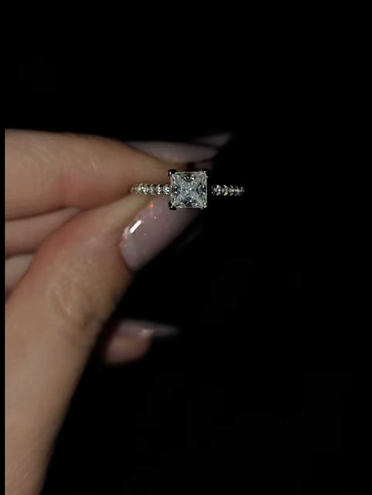 - Pietre: - Moissanite solitaire de 1 carat cu tăietura princess – oferind un joc impresionant de lumini și o strălucire vibrantă