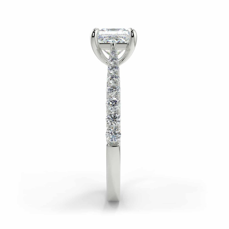 - Moissanite pe laterale, dispuse pe banda inelului, pentru a adăuga un efect de strălucire continuă