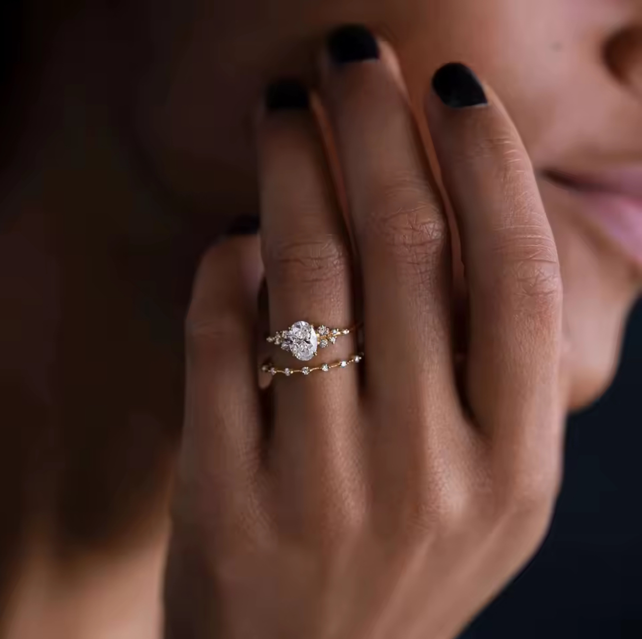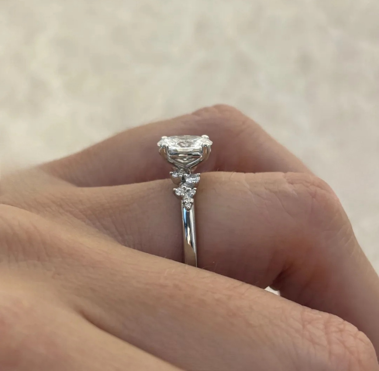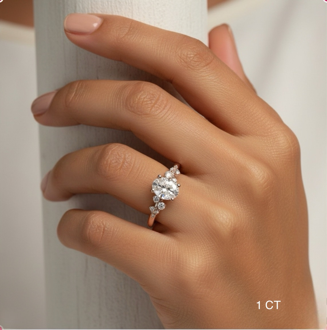 Un inel de logodnă cu un aer poetic, perfect pentru un moment memorabil. Această piesă delicată este realizată din argint placat cu platina sau aur galben, fiind accentuată de o piatră centrală impresionantă: un moissanit de 1 sau de 2 carate, tăietură ovală, culoare D și claritate VVS — un simbol strălucitor al iubirii pure.