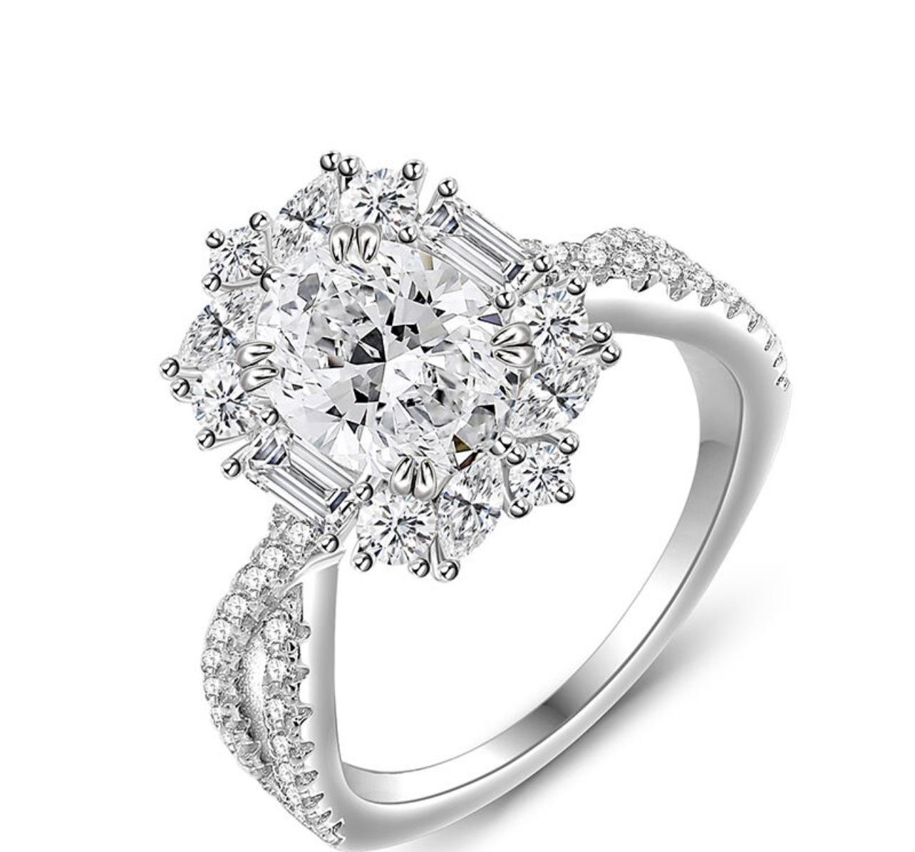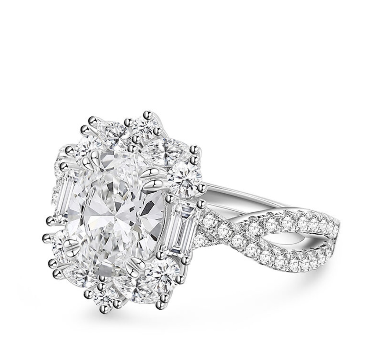 Această interpretare bohema a unui design halo aranjează pietrele în baghetă conică și forme rotunde în jurul unei pietre centrale tăiate oval. Formele diferite ale pietrelor imbinate intr-un stil unic in jurul unui moissanit de 2 carate subliniază și mai mult complexitatea designului și calitatea măiestriei.