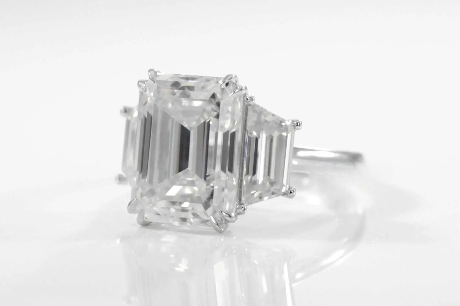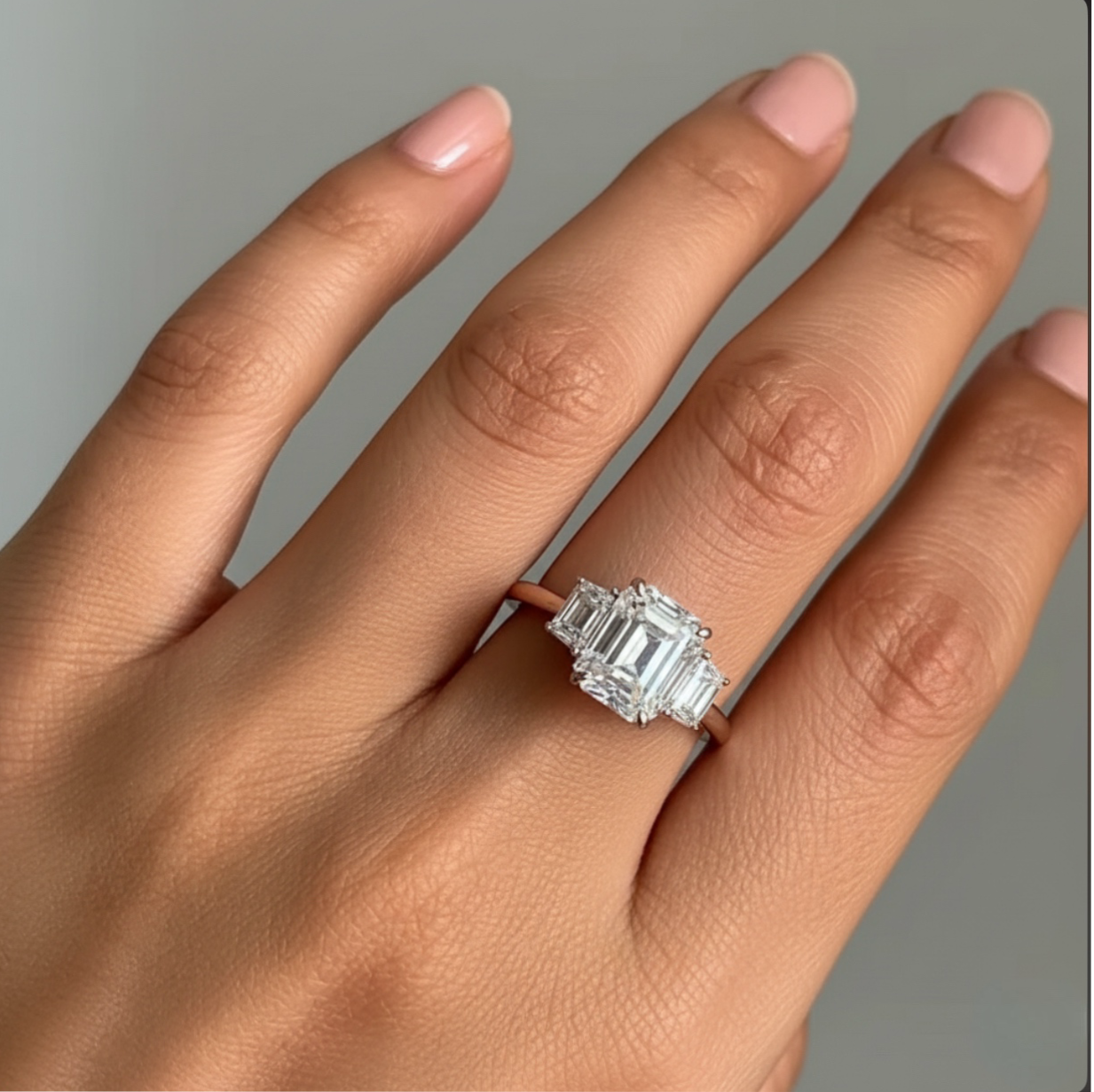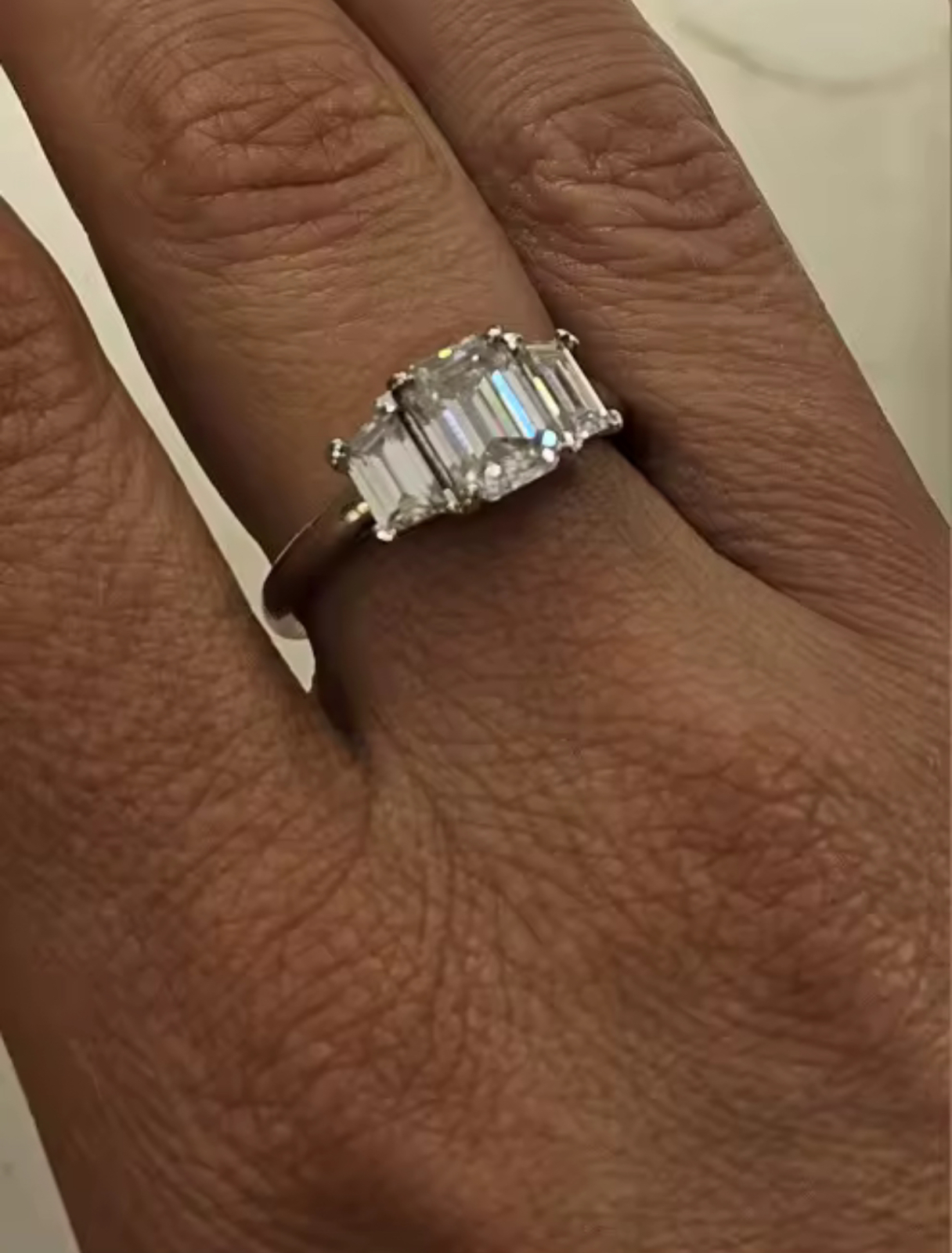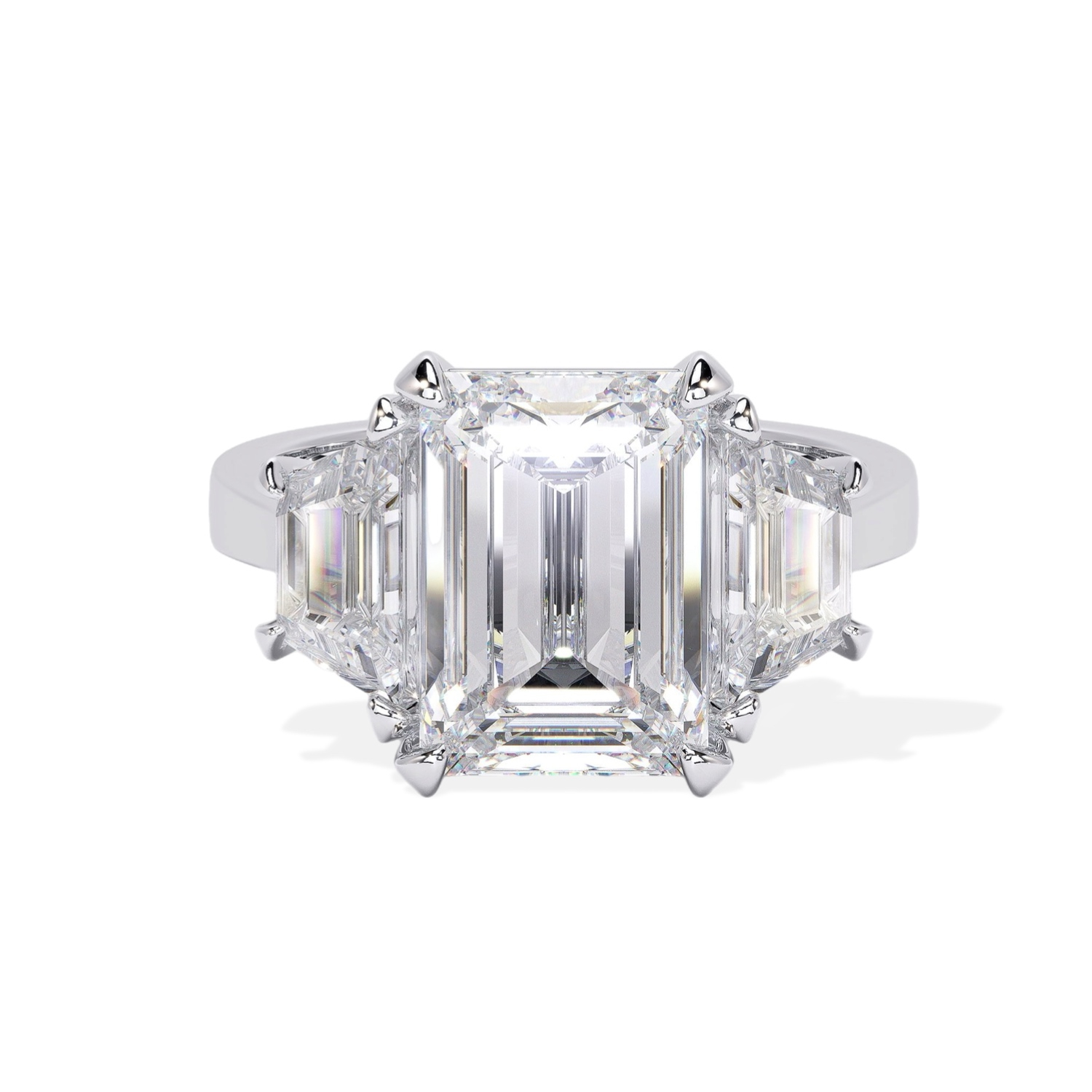 Piatra centrală, un moissanite de 2 carate, tăietură Emerald, fascinează prin claritatea sa geometrică și reflexiile limpezi care amintesc de oglinzi de lumină pură. Două moissanite laterale de 0,3 carate fiecare completează perfect designul, adăugând profunzime și simetrie.