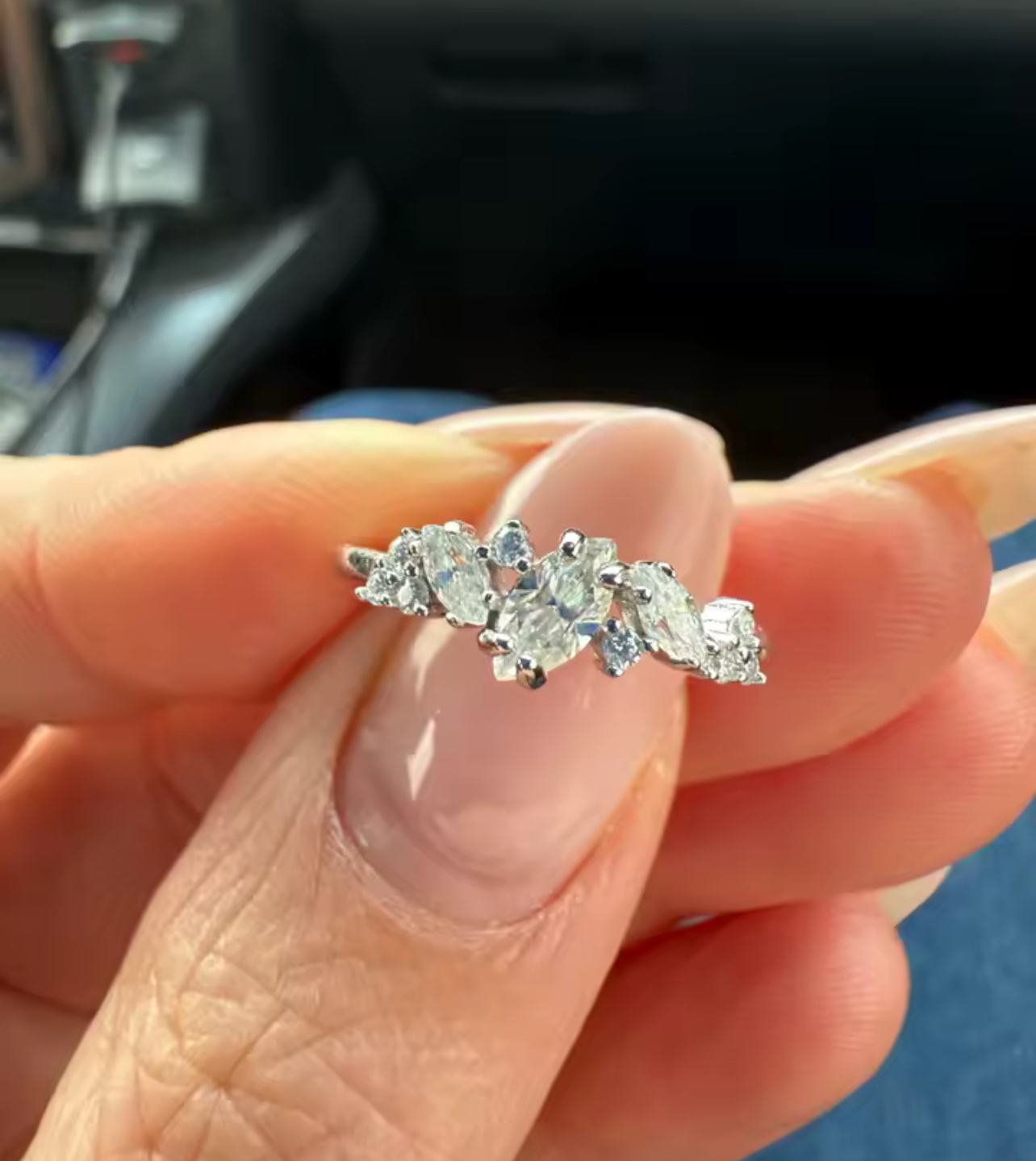 Piatra centrală, un moissanite tăiat marquise de 0.3 carate, este pusă în valoare de pietre laterale rotunde și marquise ce adaugă profunzime și eleganță designului.